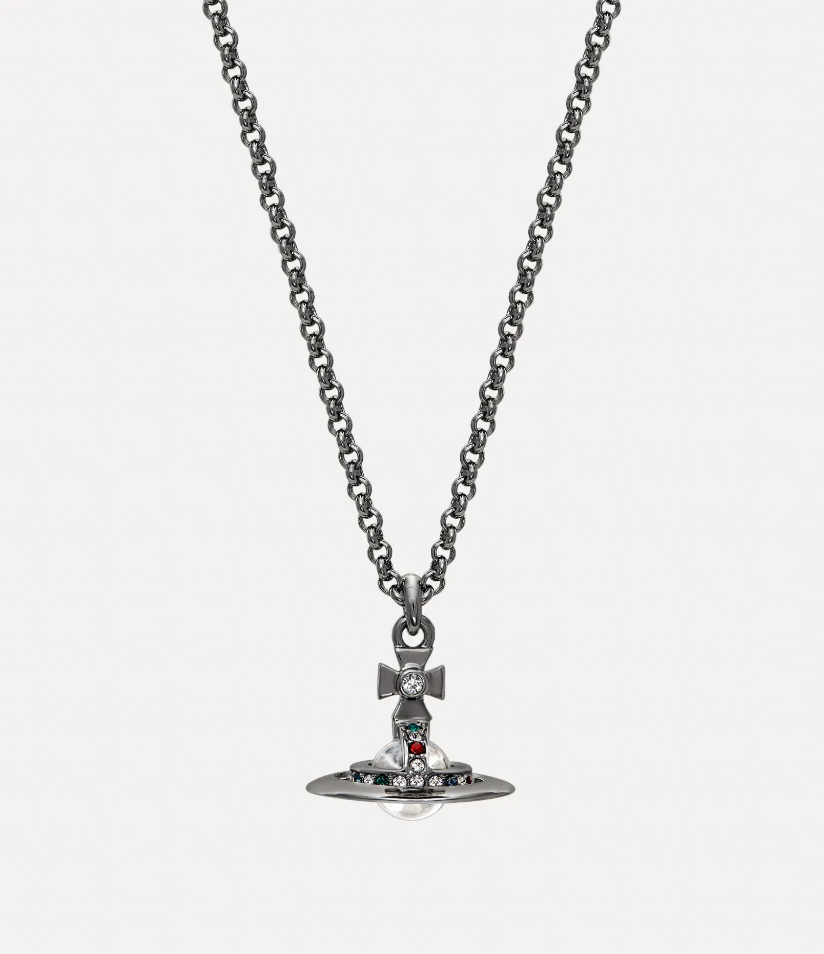 Our New Petite Orb Pendant necklace has been updated this season with gunmetal-tone plating. Encrusted with glistening red, emerald and white crystal details, the design incorporates our signature three-dimensional orb in the centre of the chain – synonymous with Vivienne’s vision of launching tradition into the future.