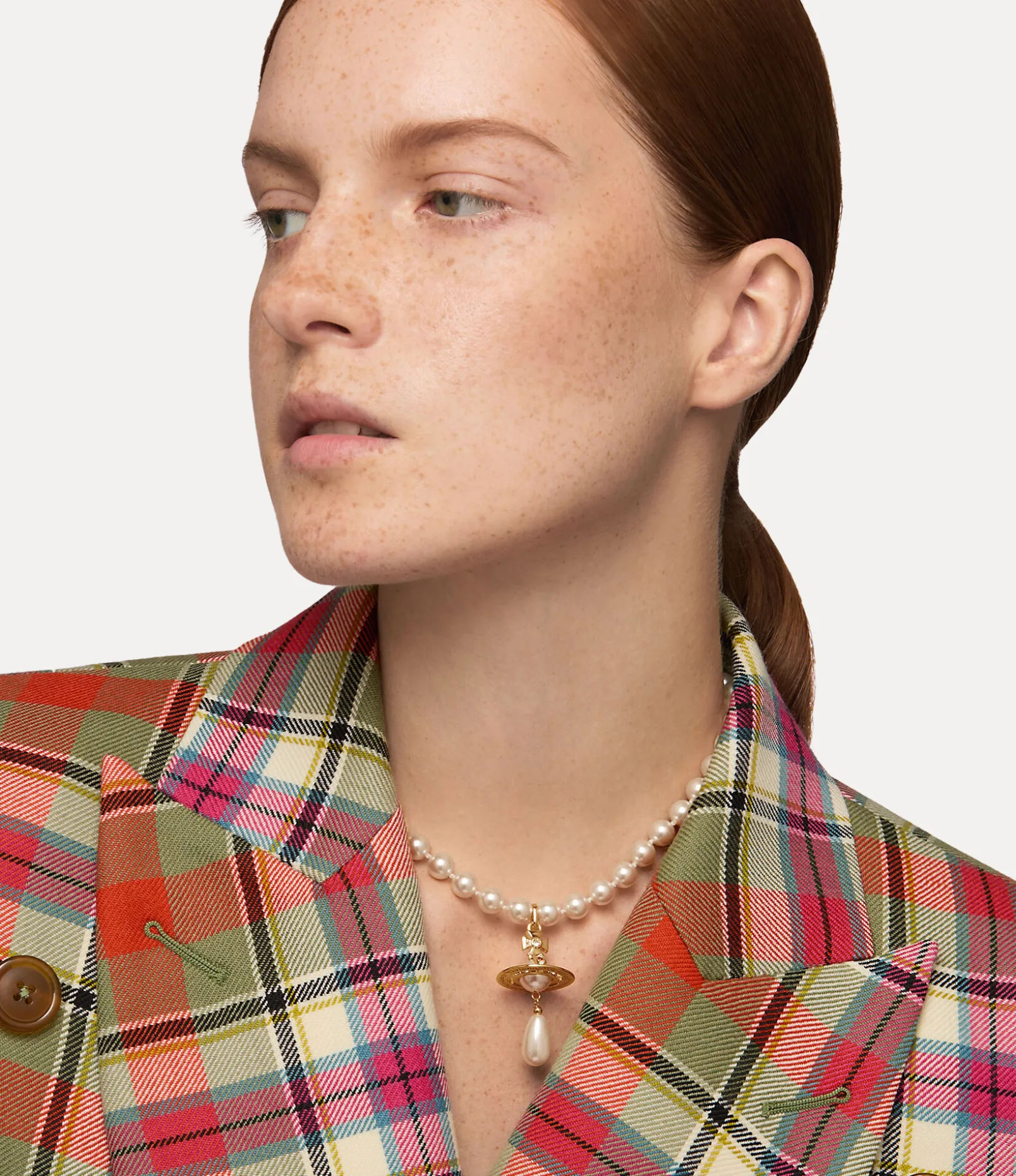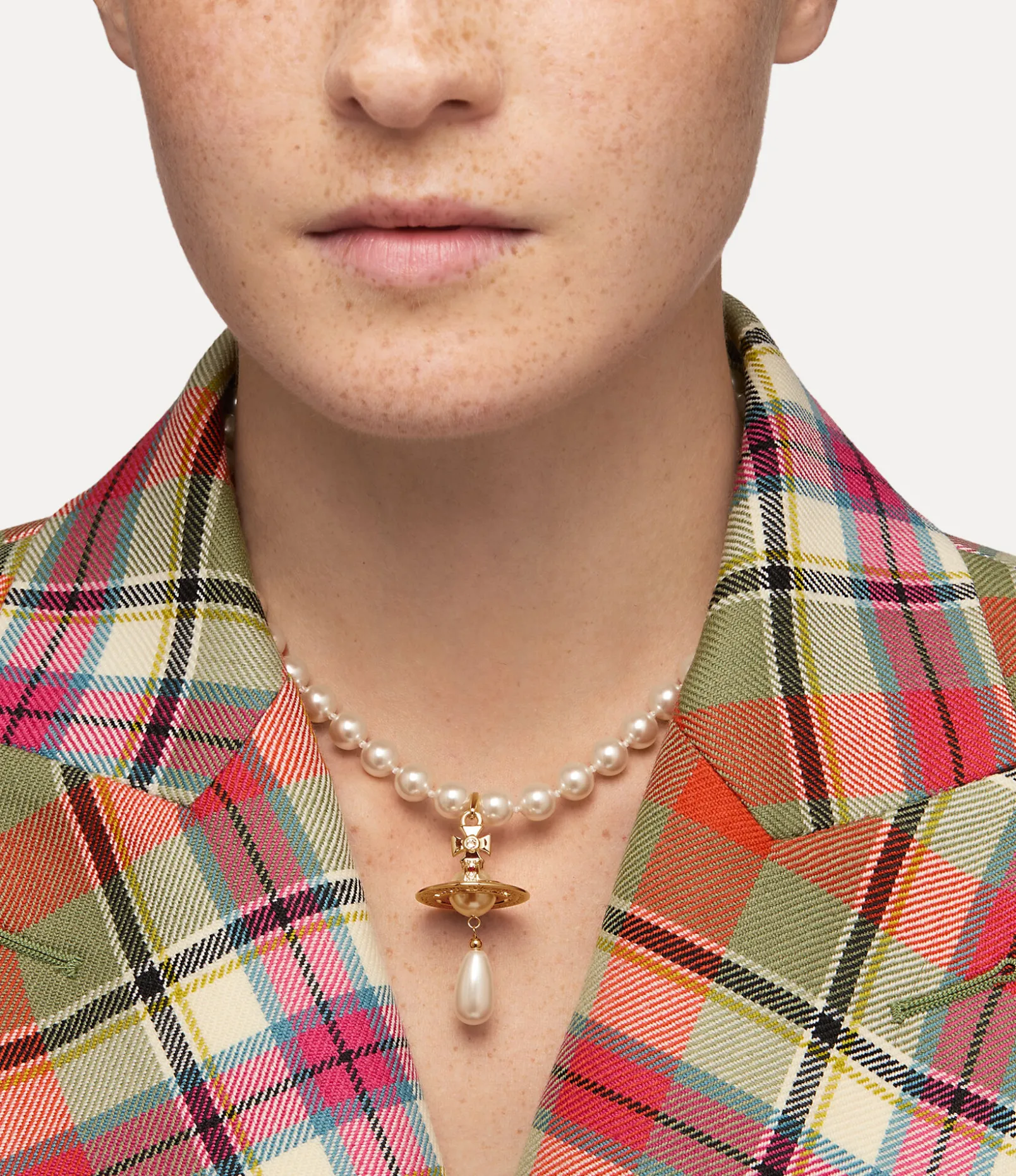 In the late 1980s, Vivienne Westwood unveiled her iconic pearl concept during the Harris Tweed Fall 1987 fashion show, featuring a single-strand choker. Our One Row Pearl Drop choker echoes the elegant form of her original design, showcasing a three-dimensional orb motif adorned with crystal accents and a suspended teardrop, pearl detail.