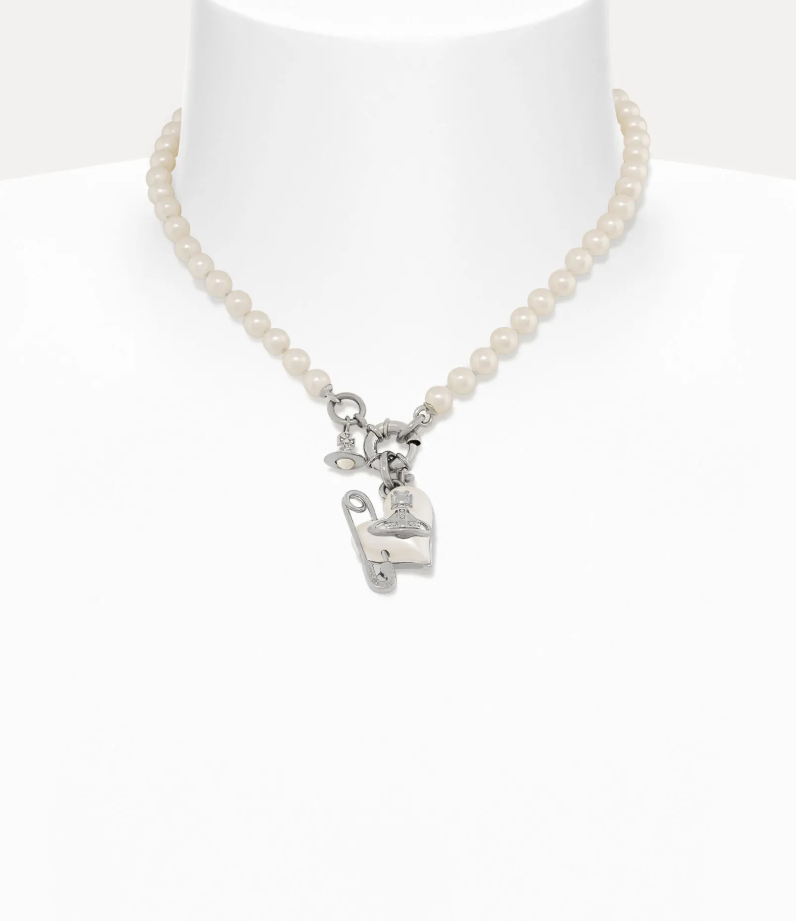 Crafted with silver-tone plating, the Orietta Pearl necklace features a row of 6mm glass-based Swarovski pearls, hand-knotted onto the thread. The design is highlighted by our signature asymmetric heart motif and a central orb, adorned with a safety pin detail – a nod to Vivienne’s punk-inspired, non-conformist aesthetic.