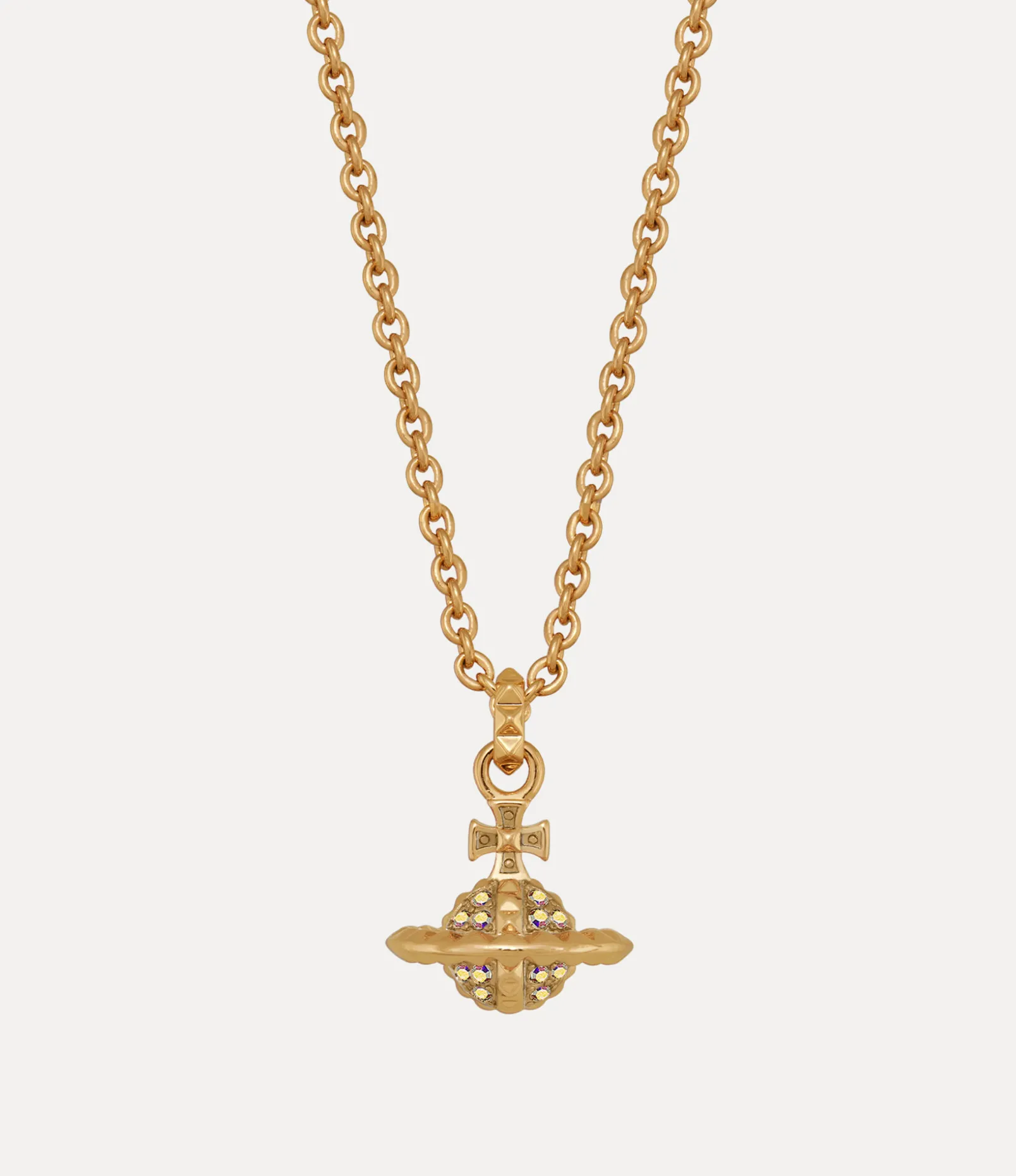 The design of our Small Mayfair Orb Pendant necklace draws inspiration from our signature orb emblem – synonymous with Vivienne’s vision of launching tradition into the future. The piece features a three-dimensional orb pendant in the centre of the design, embellished with iridescent gemstones and highlighted by stud details, evoking the house’s signature punk approach.