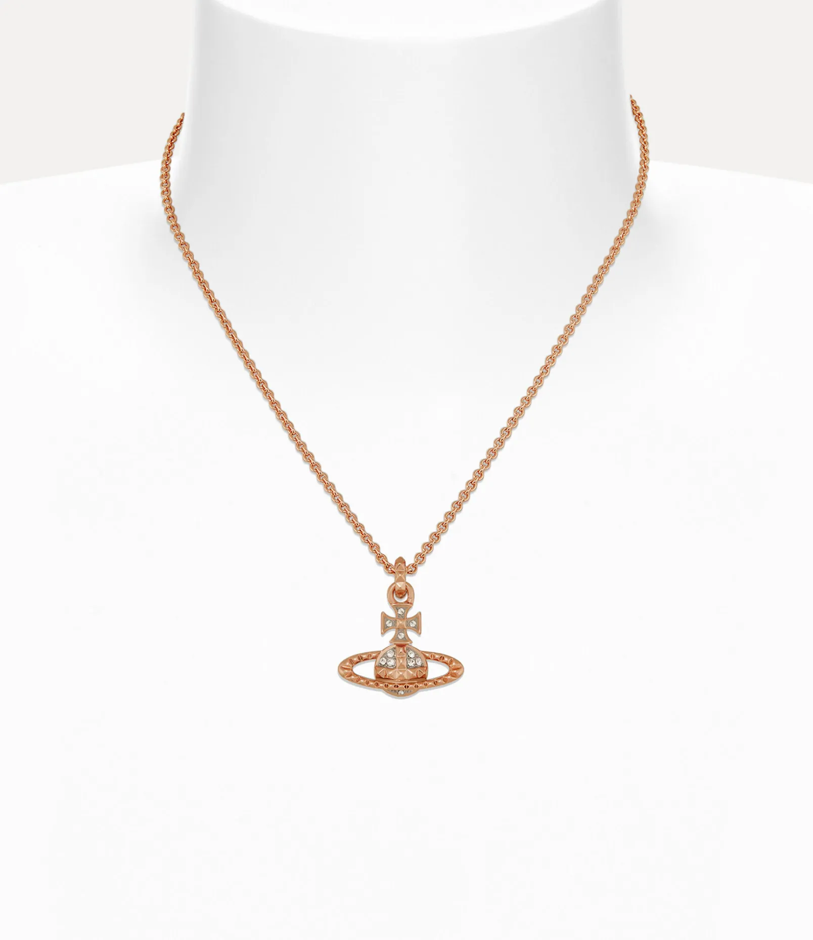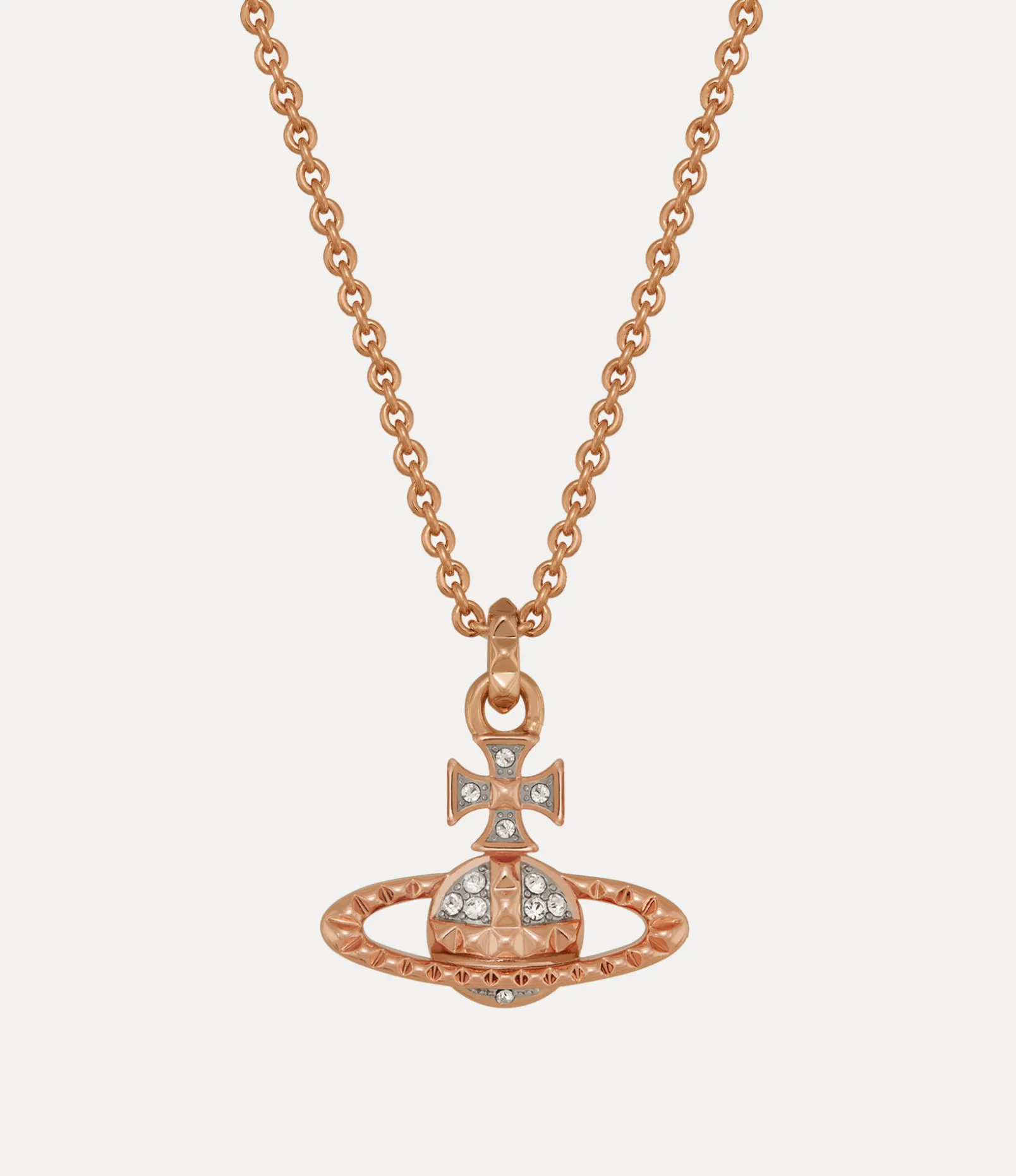 The Mayfair Bas Relief Pendant necklace returns this season with pink gold-tone plating and glistening crystal embellishments. The piece features an orb-shaped silhouette, synonymous with the house’s vision of launching tradition into the future, complete with stud details, symbols of non-conformity – following Vivienne’s signature punk approach.