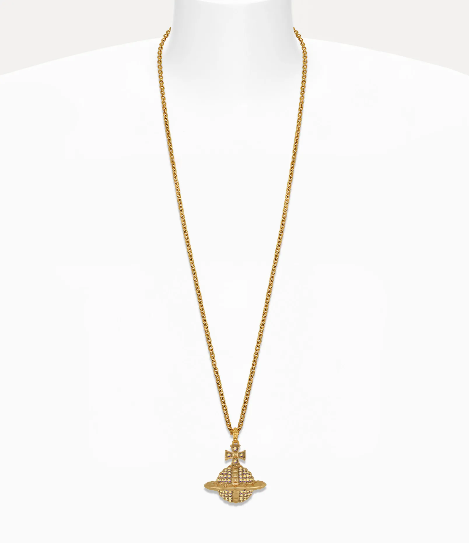 Our Mayfair Large Orb Pendant necklace has been updated with gold-tone plating and encrusted with iridescent gemstones. Pyramid-stud accents throughout the design symbolize non-conformity, paying tribute to the house’s iconic punk aesthetic. Featuring our signature orb motif, this statement piece embodies Vivienne’s vision of launching tradition into the future.
