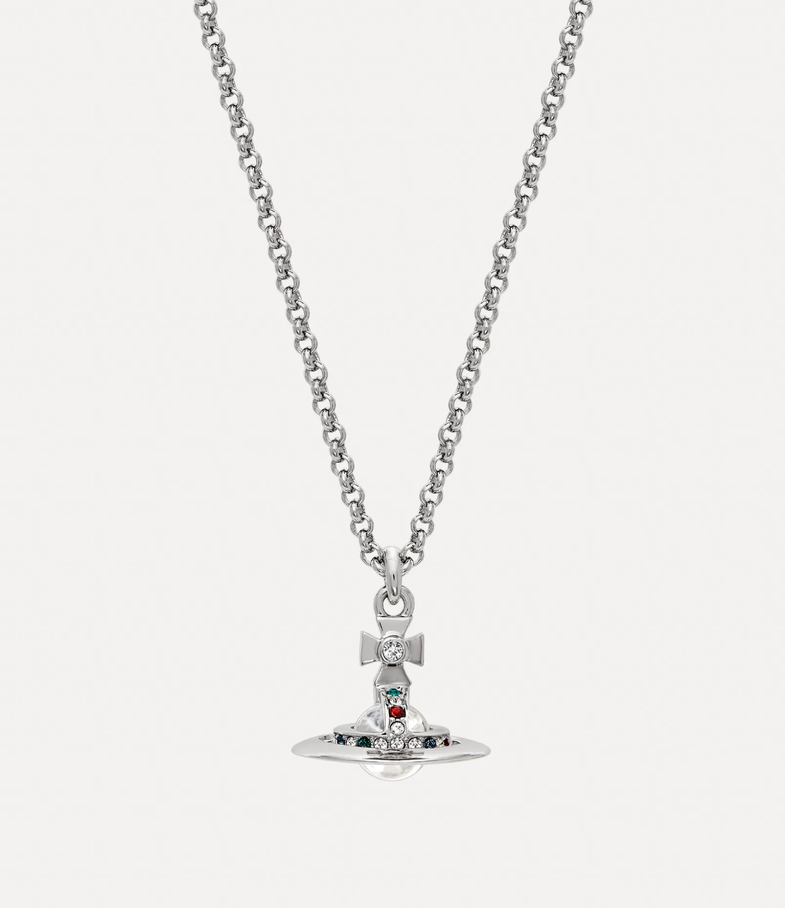 The orb silhouette is an essential element of the house’s iconography, recalling Vivienne’s vision of launching tradition into the future. Our New Petite Orb Pendant necklace receives an orb in the centre of the trace chain, adorned with red, emerald and white crystal details, complete with a silver-tone metal finish.