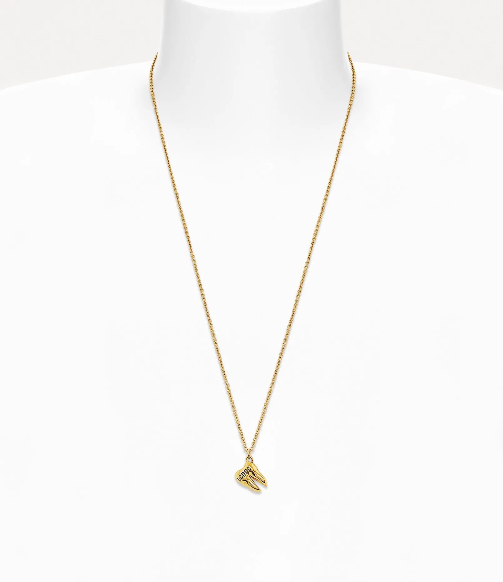 Our Rima pendant necklace is a nod to our longstanding tradition of teeth-inspired jewellery, tracing back to the iconic Spring-Summer 1997 ‘Vive La Bagatelle’ collection. Crafted with a polished plating finish, this pendant features intricate detailing on the tooth head, complete with the house’s signature in black patina. It hangs elegantly from a trace chain and is secured with a lobster clasp closure, accompanied by an engraved oval tag.