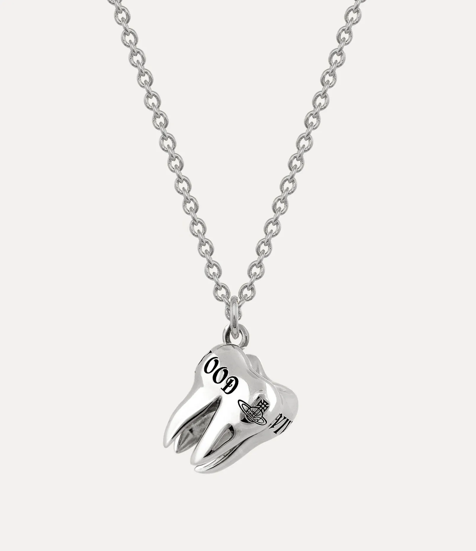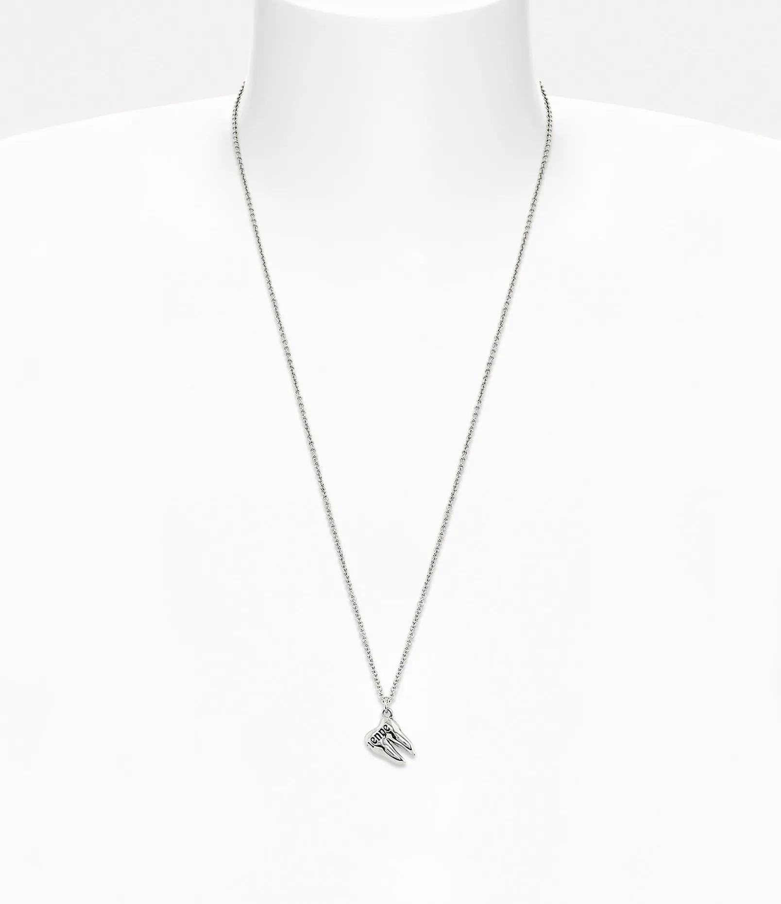 Our Rima pendant necklace is a nod to our longstanding tradition of teeth-inspired jewellery, tracing back to the iconic Spring-Summer 1997 ‘Vive La Bagatelle’ collection. Crafted with a polished plating finish, this pendant features intricate detailing on the tooth head, complete with the house’s signature in black patina. It hangs elegantly from a trace chain and is secured with a lobster clasp closure, accompanied by an engraved oval tag.