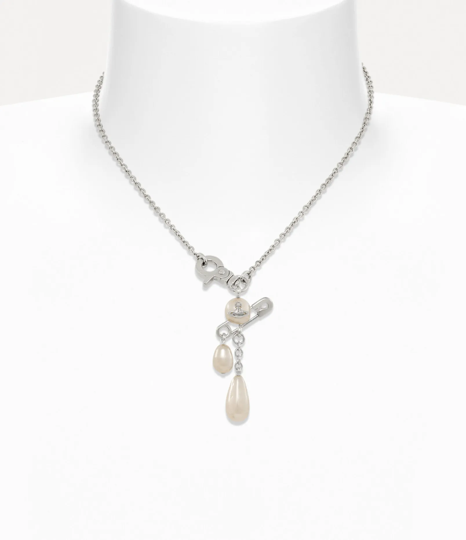 Crafted with silver-tone plating, the Claude Small necklace features a rounded pearl with a central orb, accented by a signature safety pin detail—a nod to Vivienne’s punk-inspired, non-conformist style. A pearl drop and delicate chain details hang elegantly from the pendant, adding movement to the design, while the hardware-inspired clasp allows for an easy closure.