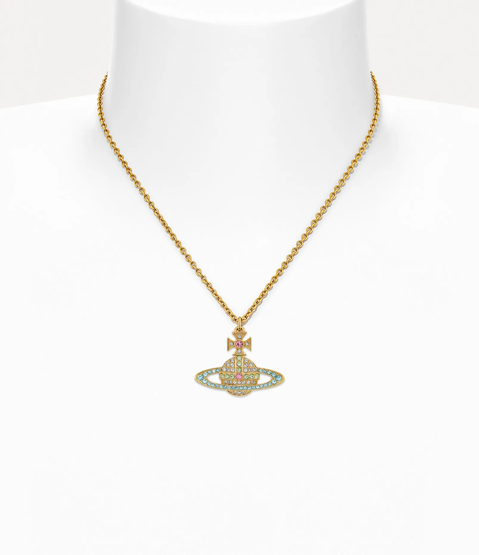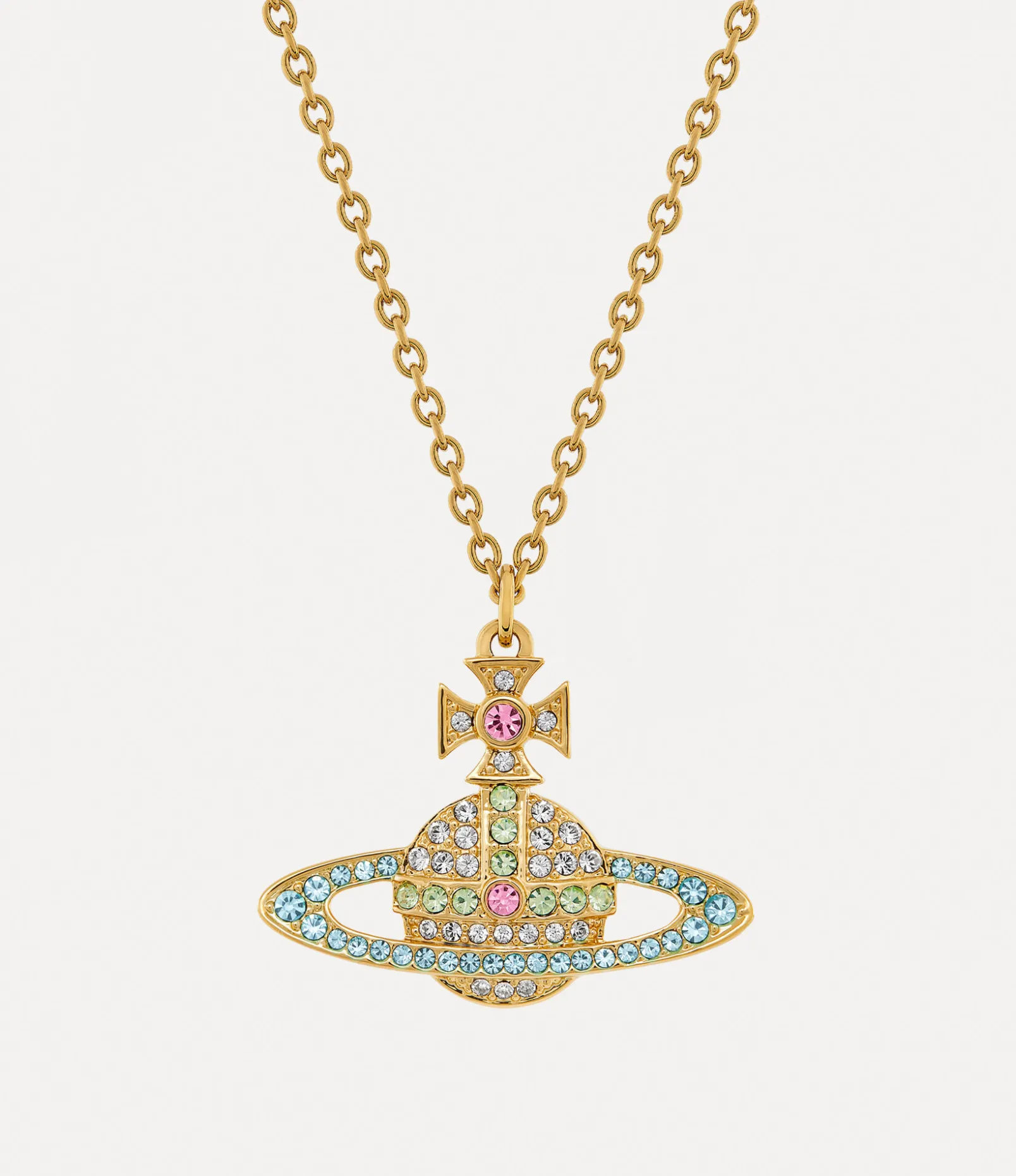 Our Kika Pendant necklace has been revamped this season, now featuring a gold-tone plating and light blue and green crystal detailing. The statement necklace features our signature orb pendant, set with pave-style embellishments along the Saturn ring.