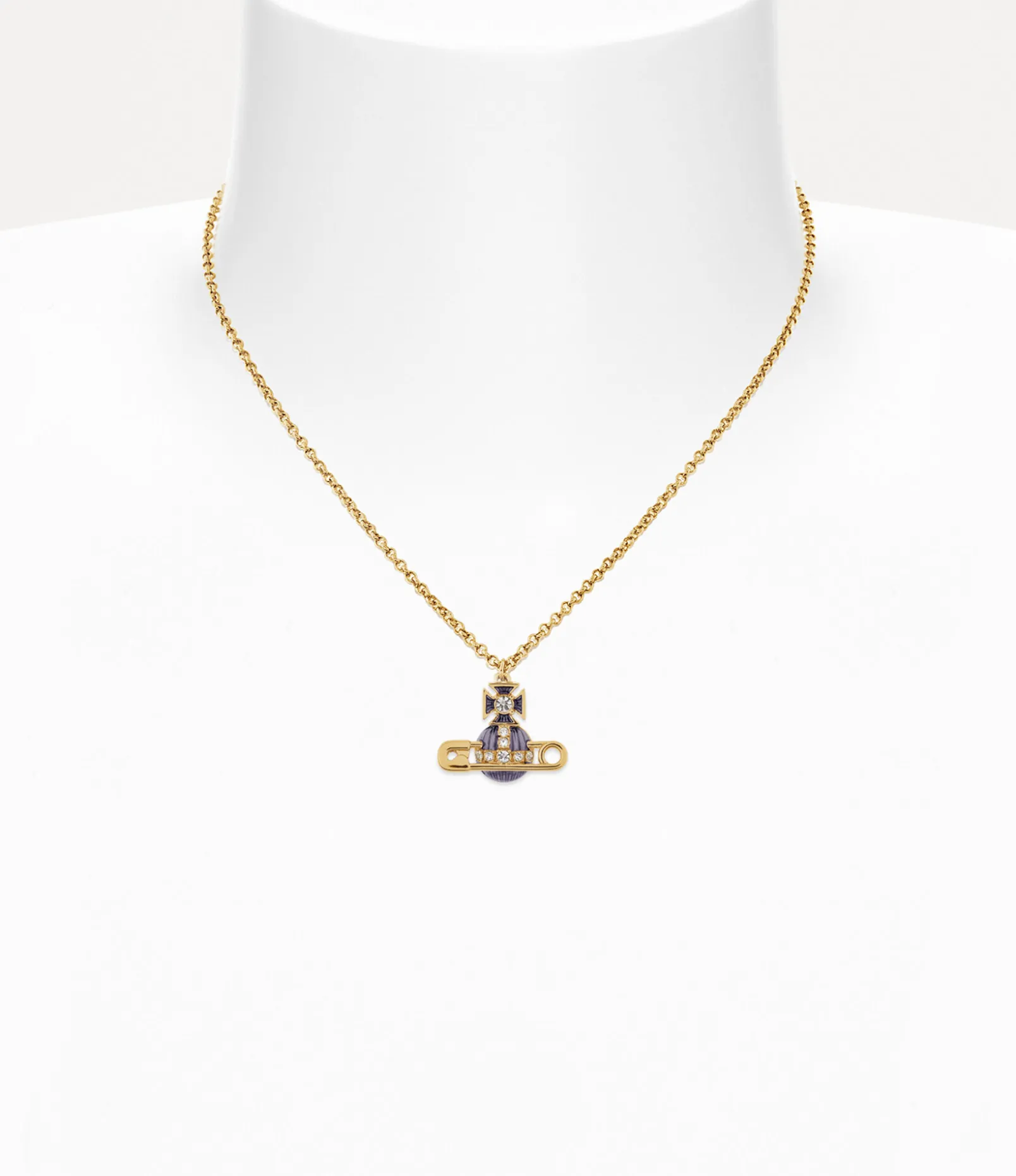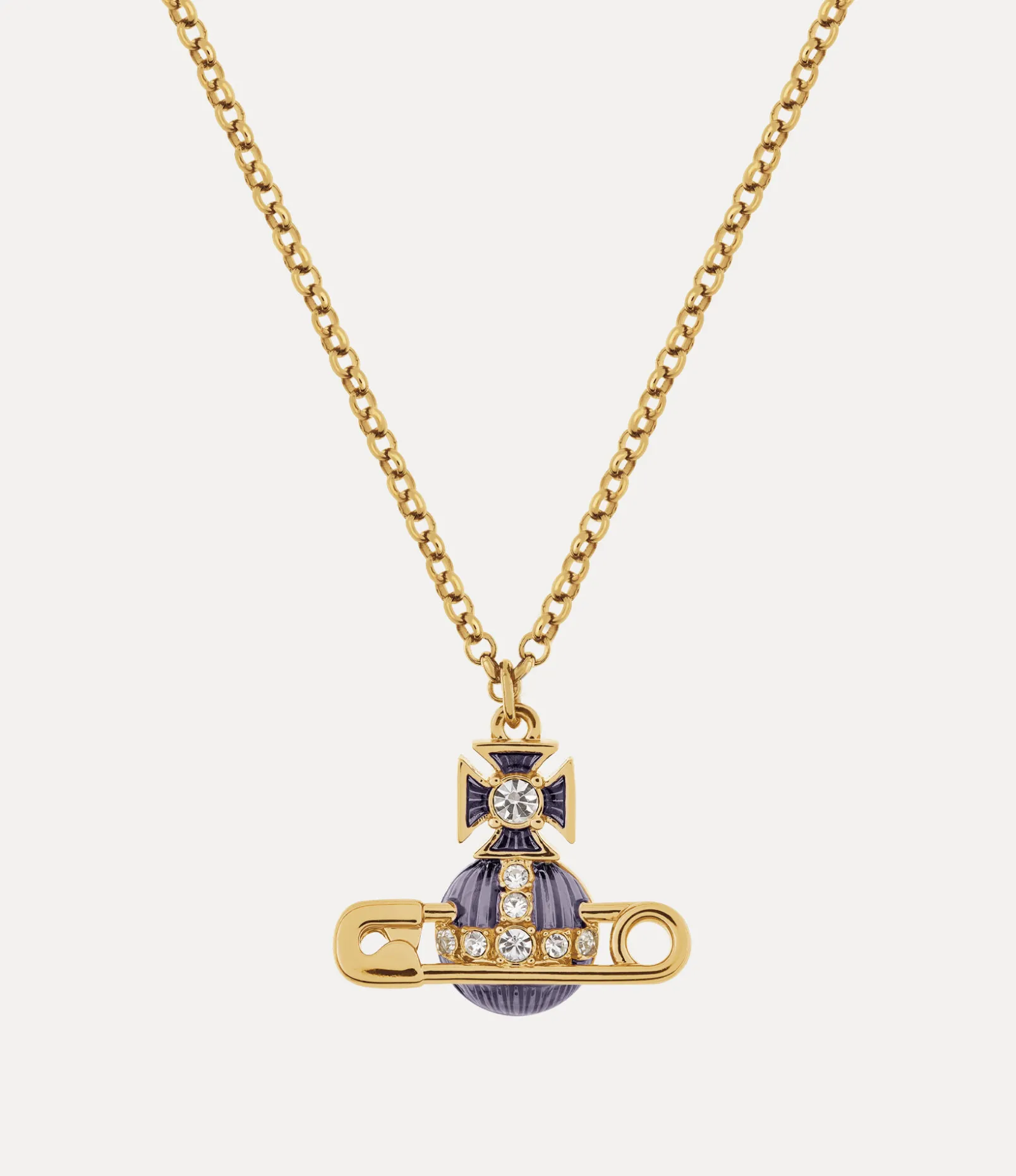 The timeless safety pin motif has become integral to our house’s iconography, evoking a sense of non-conformity, reminiscent of Vivienne’s signature punk approach. This season’s Kitty pendant revives this motif with gold-tone plating, complete with translucent violet enamel detailing.