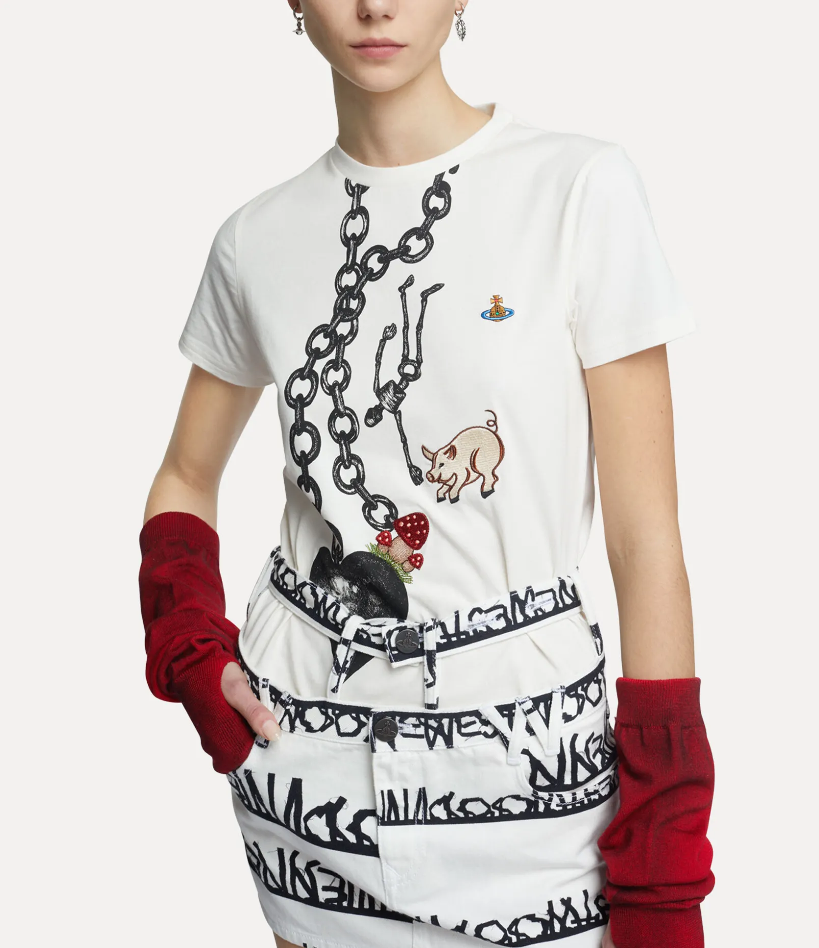 Our Eli arm warmers feature a soft woollen silhouette, complete with a hand-sprayed pattern that contours the shape of the arm and hand. The piece receives a multicoloured embroidered orb on the right-hand side, synonymous with Vivienne’s vision of launching tradition into the future.