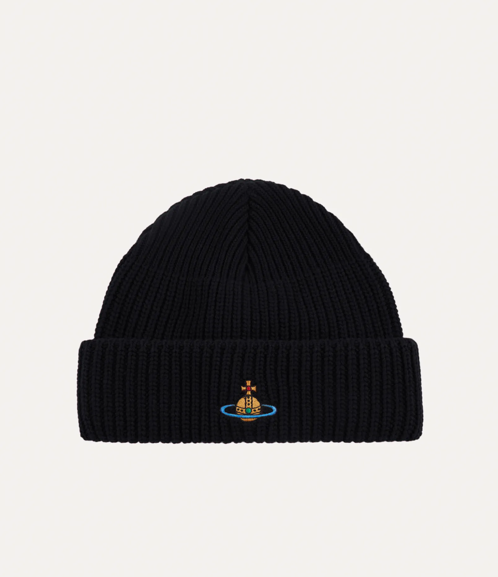 Our Sporty beanie features an all-over ribbed finish, complete with a chunky knit. The multicoloured orb embroidery on the front of the wide folded brim draws inspiration from the house’s iconic orb motif – synonymous with Vivienne’s vision of launching tradition into the future.