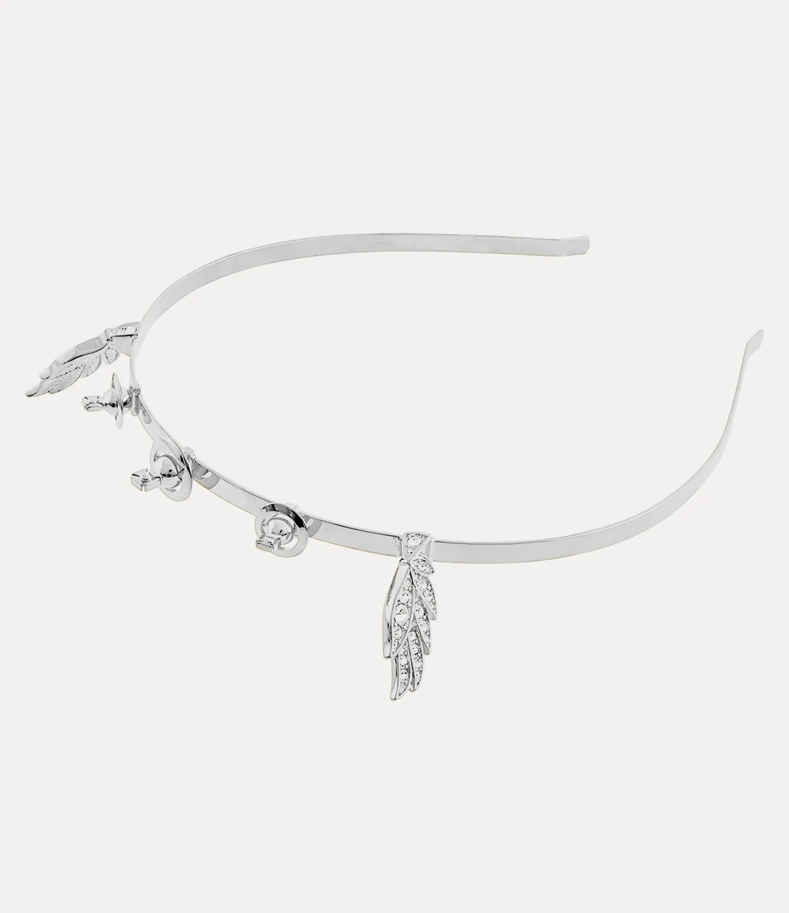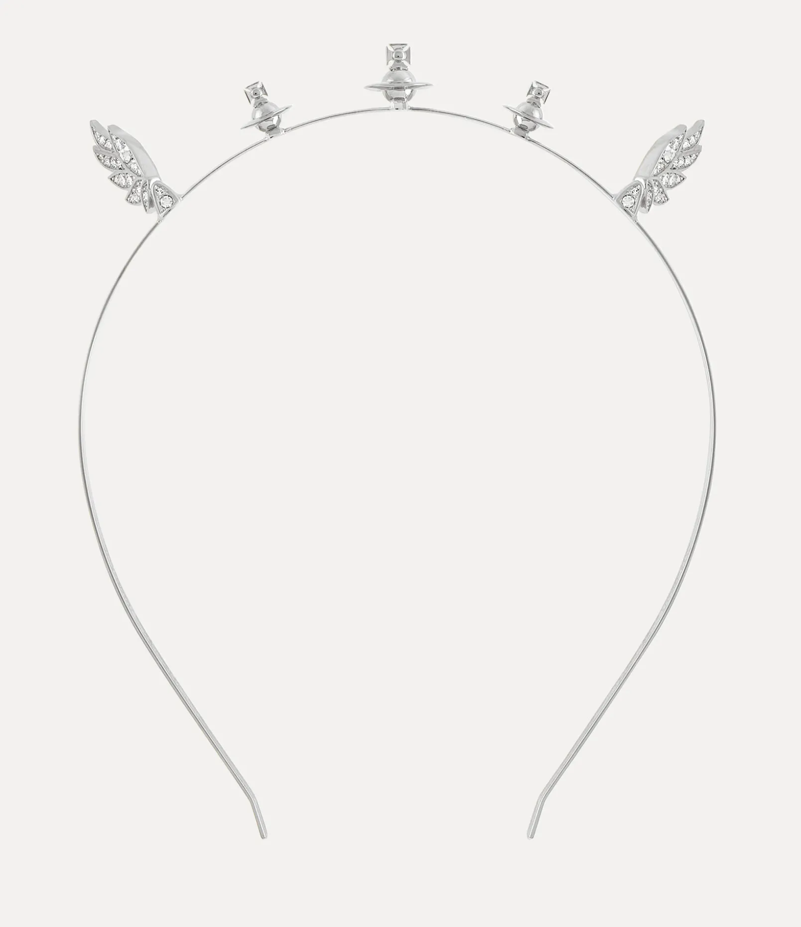 Our Cassendra Alice band features our timeless orb motif, an essential element of the houses heritage, which embodies Vivienne’s revolutionary vision of launching tradition into the future. This statement headband, crafted in polished silver-tone plating, features wing-shaped silhouettes, inspired by Vivienne Westwood’s mid-90s catwalk collections.