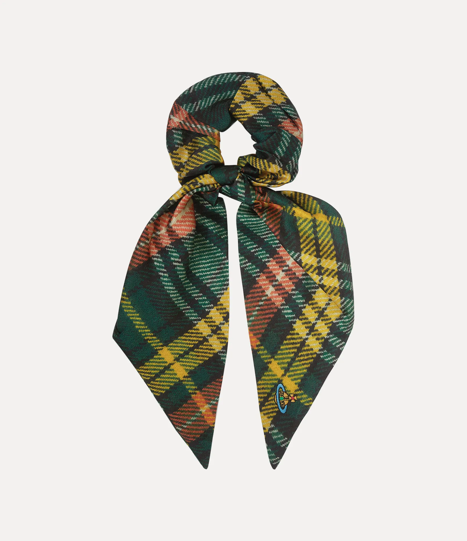 Tartan stands as a quintessential element of our heritage, embodying Vivienne’s iconic punk ethos. Our hair scrunchie showcases the signature printed Harris Tweed design, a motif first introduced in the iconic Autumn-Winter 1987/88 Harris Tweed collection. This piece is hand-finished with a multicoloured orb embroidery, symbolising Vivienne’s vision of launching tradition into the future.