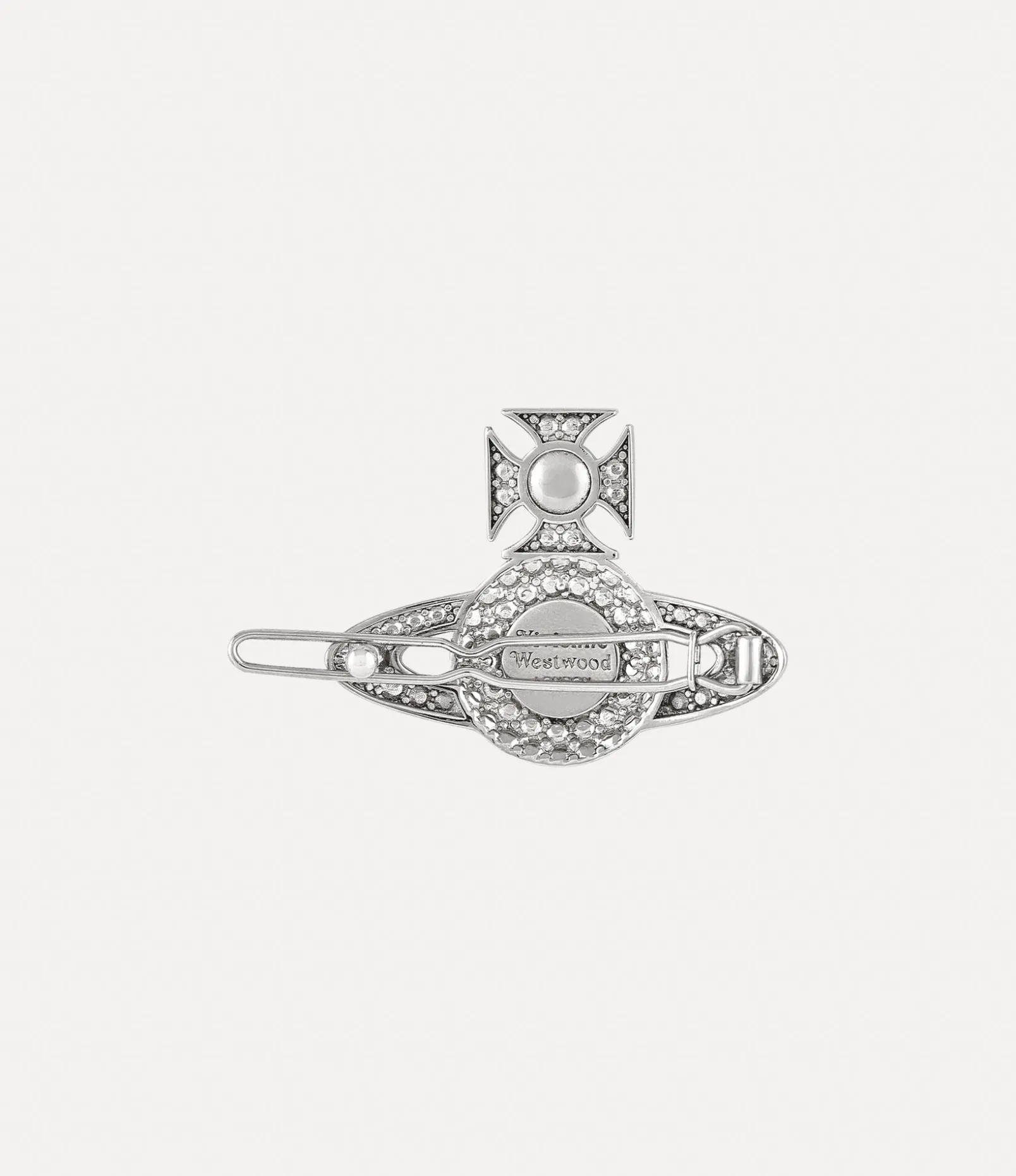 Our Corinne hair clip is cast to the silhouette of our house’s bas relief orb motif, evoking Vivienne’s vision of launching tradition into the future. The two-dimensional design features pave-set crystal details in white hues, complete with a classic silver-tone finish.