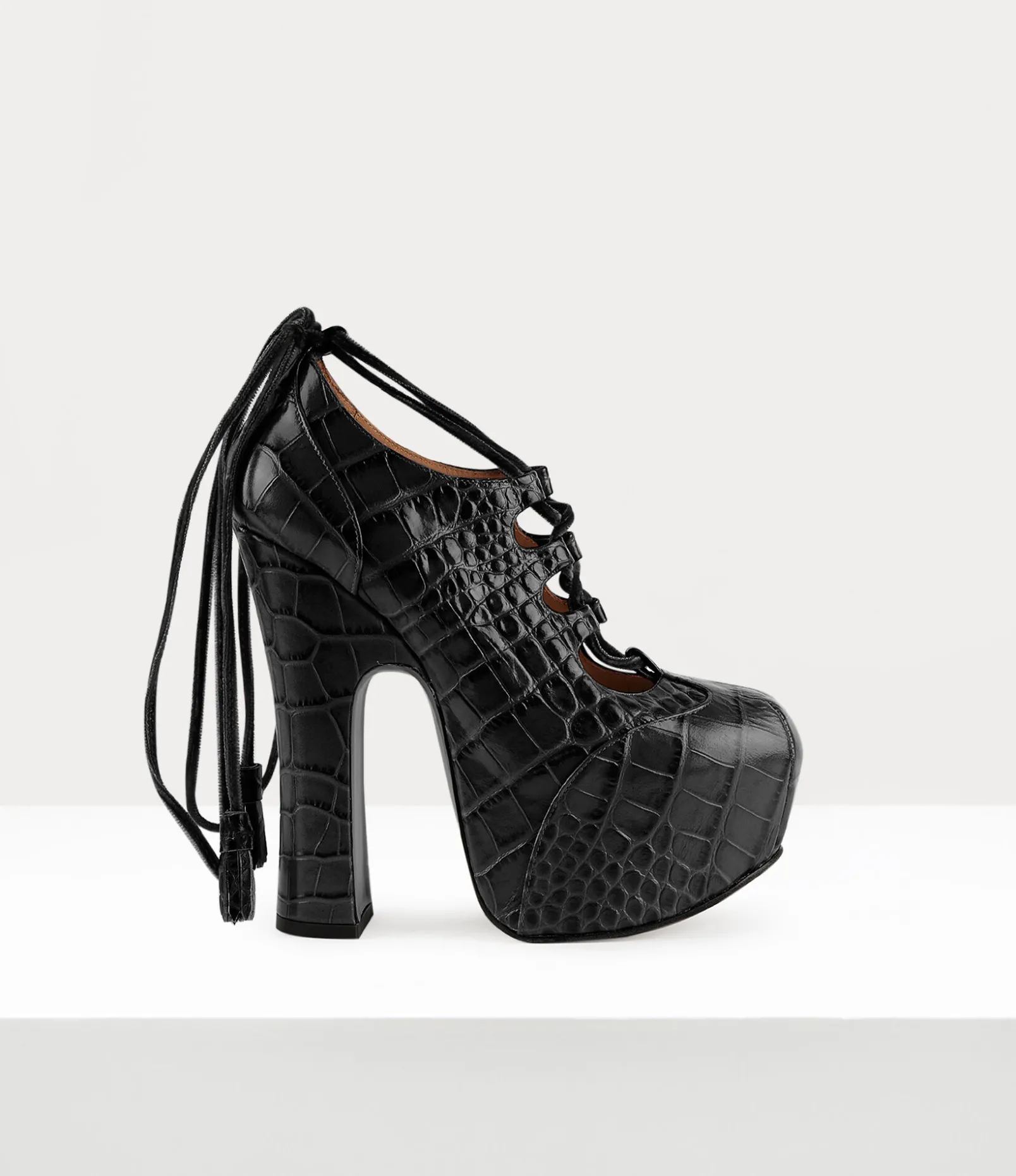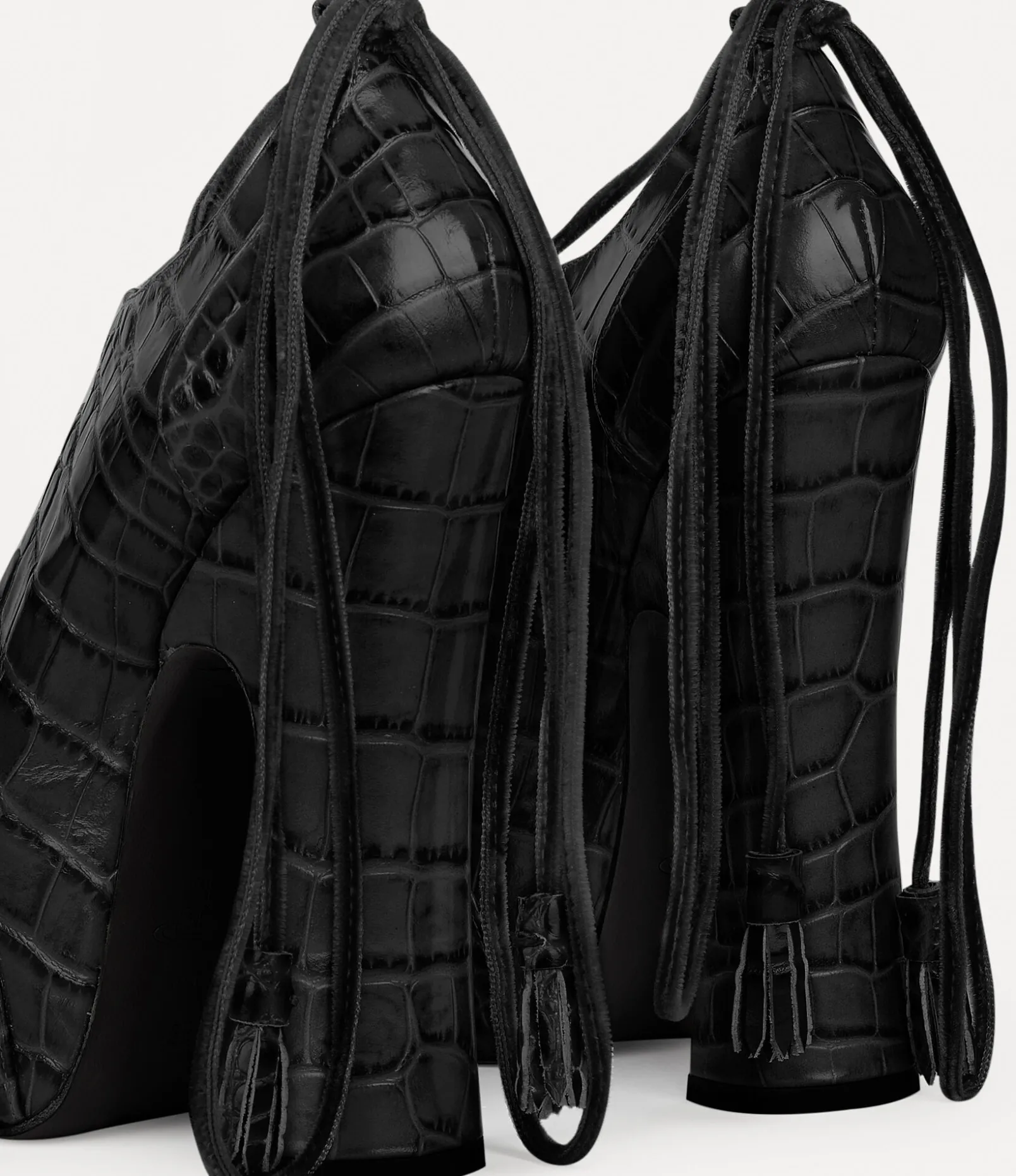 The design of the Elevated Ghille platforms, first shown in our Spring-Summer 1993 ‘Anglomania’ collection in Paris, recalls the silhouette of ghillie brogues, traditional Scottish shoes worn with Highland dress. The piece is offered in a croc-embossed finish, complete with tassel fastenings and an elevated, bold platform sole.