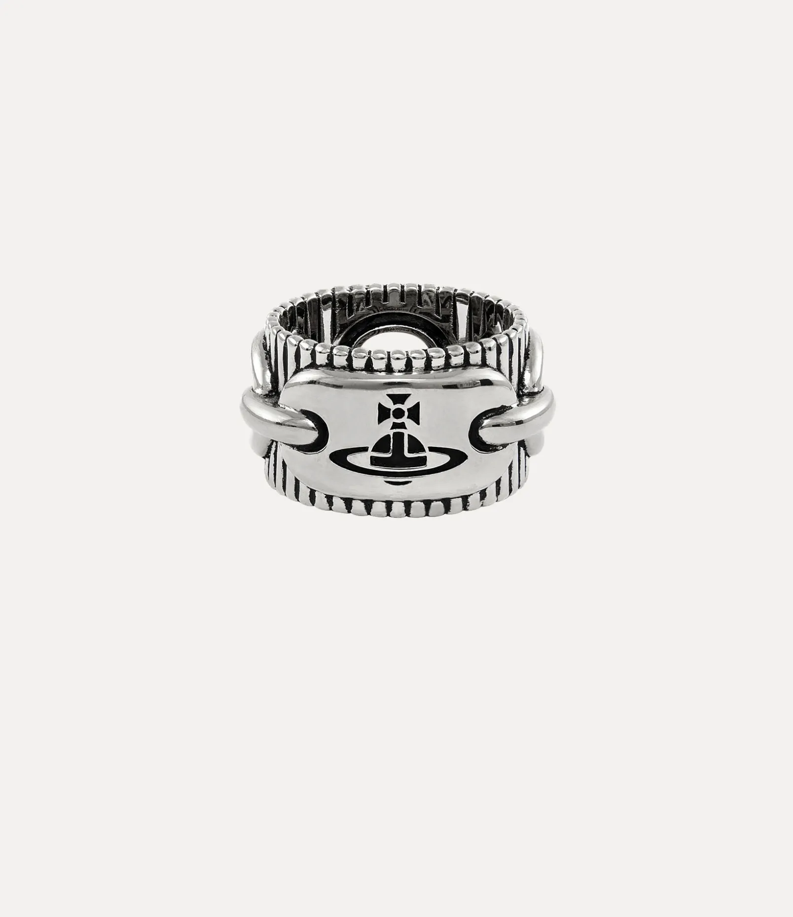 Our Ciaran ring features a wide band, complete with a recycled silver finish, enhanced by platinum-tone plating. The piece is adorned with textured line details and chain-style links, with a engraved orb motif on the face – synonymous with Vivienne’s vision of launching tradition into the future.