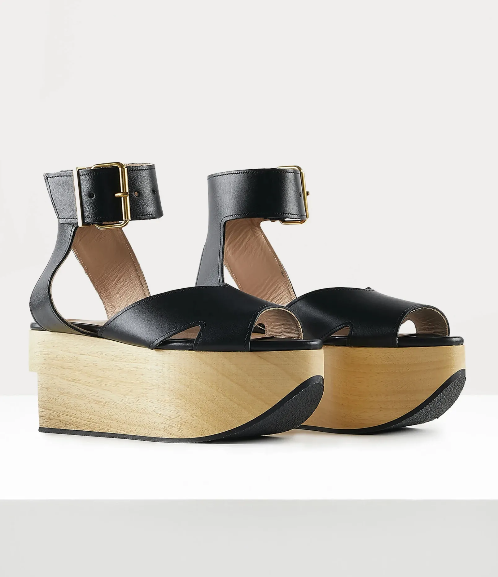 Our Rocking Horse Pagan sandals were first revealed in the Vivienne Westwood Spring-Summer 1985 ‘Mini-Crini’ collection, designed to achieve poise and movement. The cut-out detail in the wooden platform elevates the overall silhouette, paying homage to the original style.