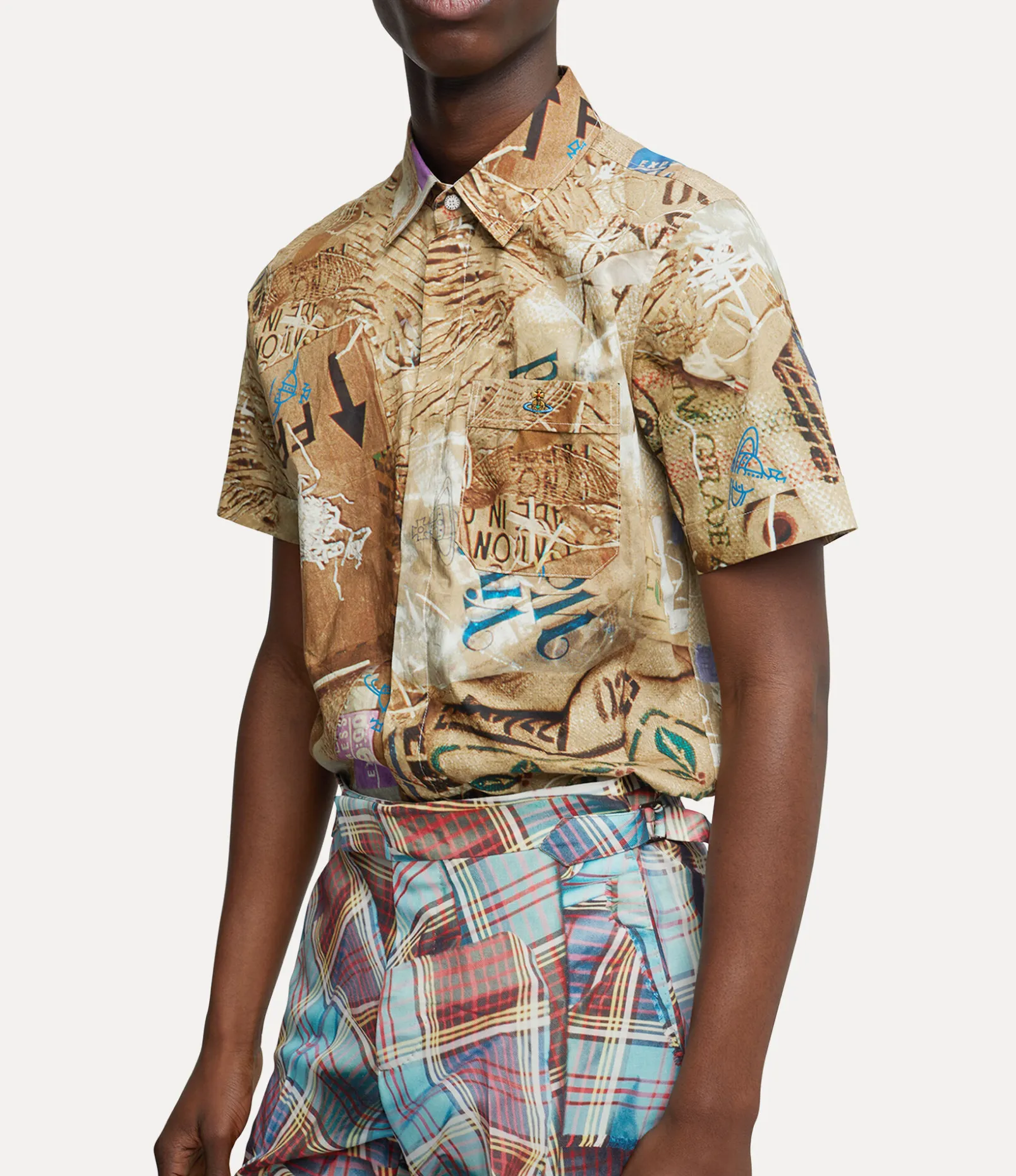 Our Classic Short Sleeve shirt revives the archive ‘Trash’ motif, composed of overlapping prints of packaging material and cardboard waste – evoking the concept of upcycling newspapers by using them to wrap valuable ornaments when moving house.