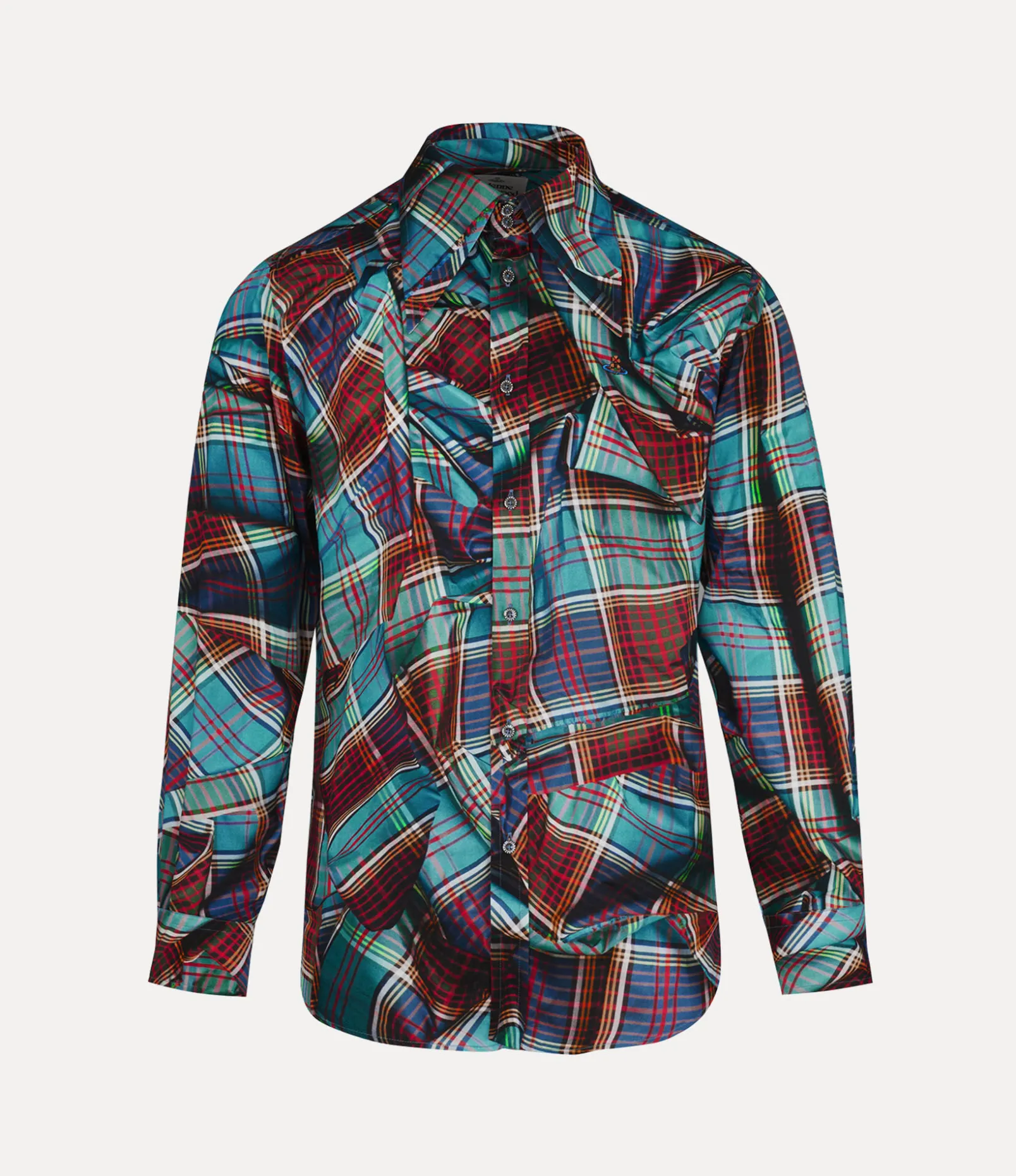 The M Violin shirt features our signature ‘Draped Tartan’ motif, a homage to the vibrant wallpaper adorning the walls of our Vivienne Westwood headquarters. The shirt’s silhouette embraces a curved hemline with a centre button placket, complete with lettering-engraved mother-of-pearl fastenings – a new development this season.