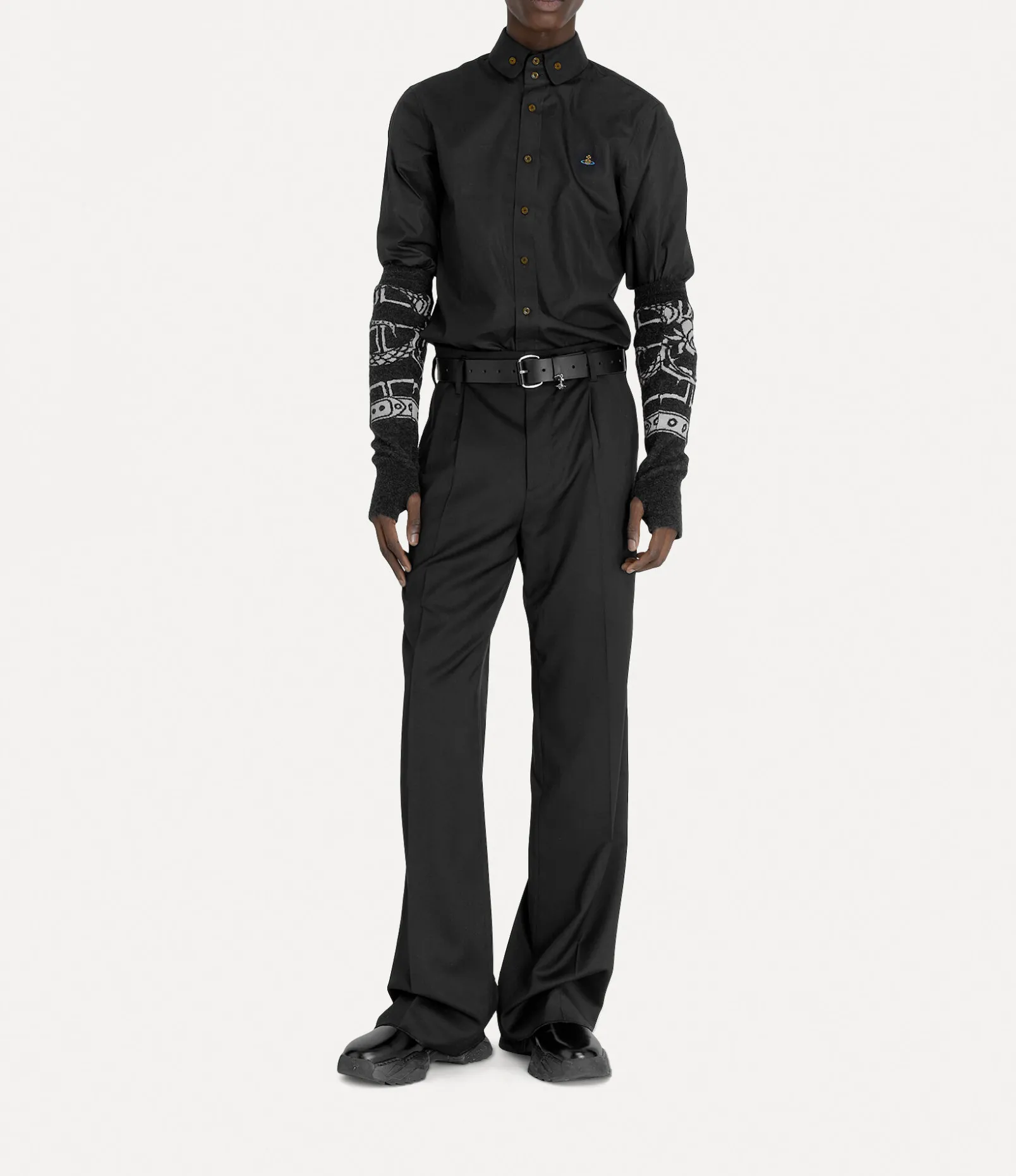 The silhouette of the Two Button Krall shirt draws inspiration from an archival design, showcasing Vivienne’s iconic two-button collar. The piece receives our signature orb embroidery on the left-hand side of the chest – synonymous with Vivienne’s vision of launching tradition into the future.