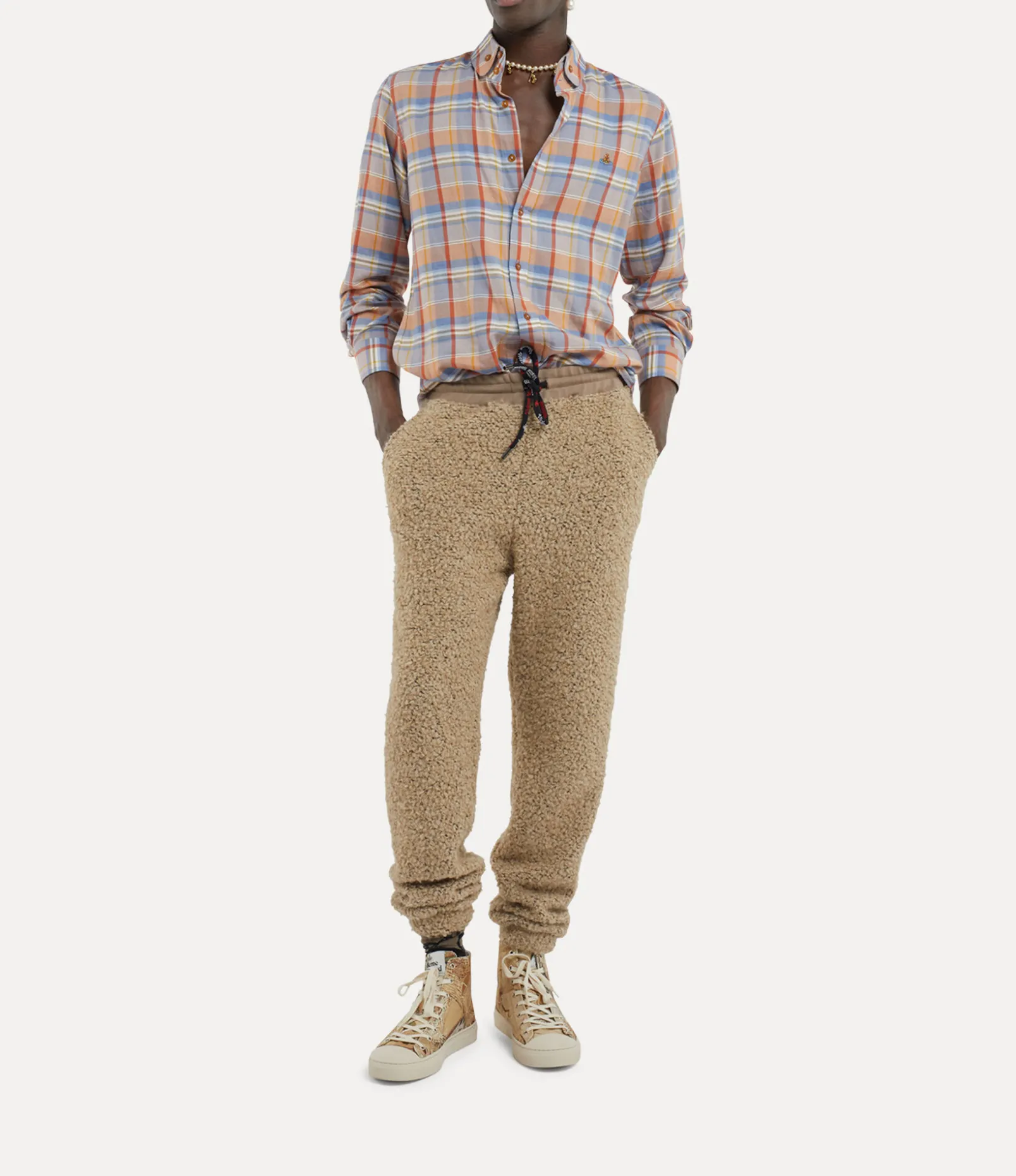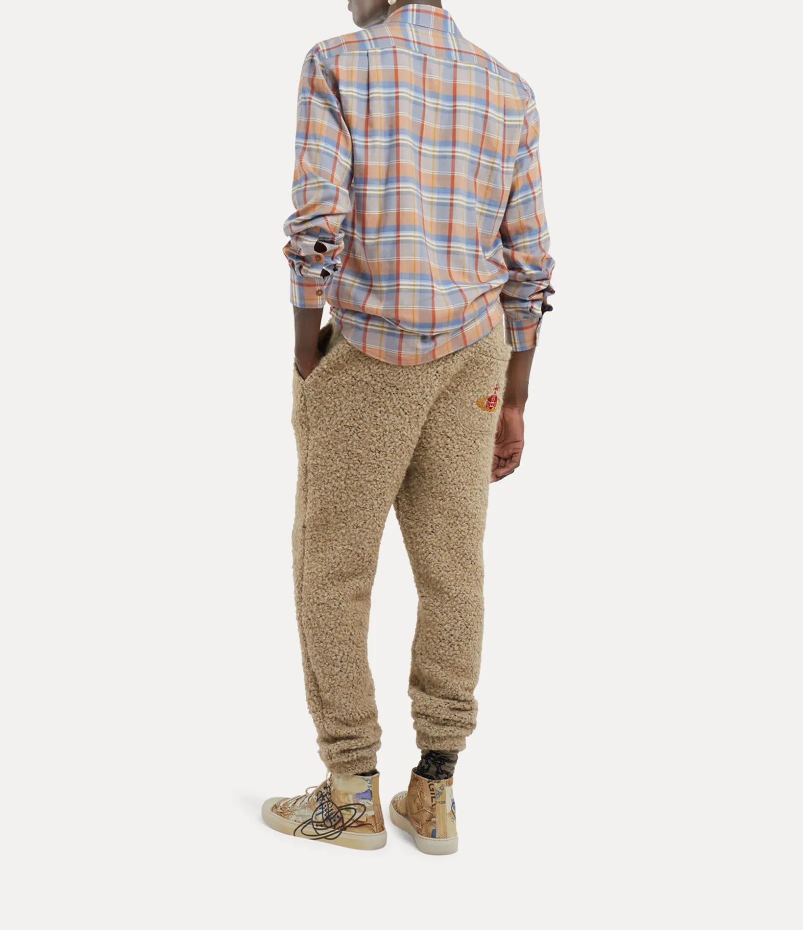 Our Two Button Krall shirt has been updated this season with an all-over checked artwork, drawing from the Neo-classical inspirations of the collection. The piece features our signature two-button collar, complete with rounded edges and an orb embroidery on the left-hand side of the chest – synonymous with Vivienne’s vision of launching tradition into the future.