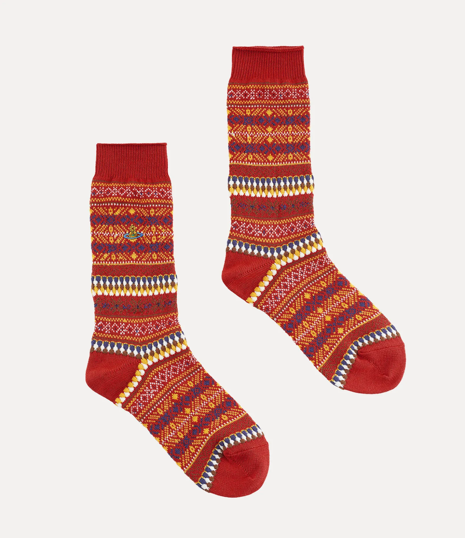 Our Ladies’ socks showcase a classic knit design that originates from the Fair Isle in Scotland. The embroidered orb motif at the ankle, developed by Vivienne Westwood during the 1980s, to represent her vision of blending tradition with innovation.