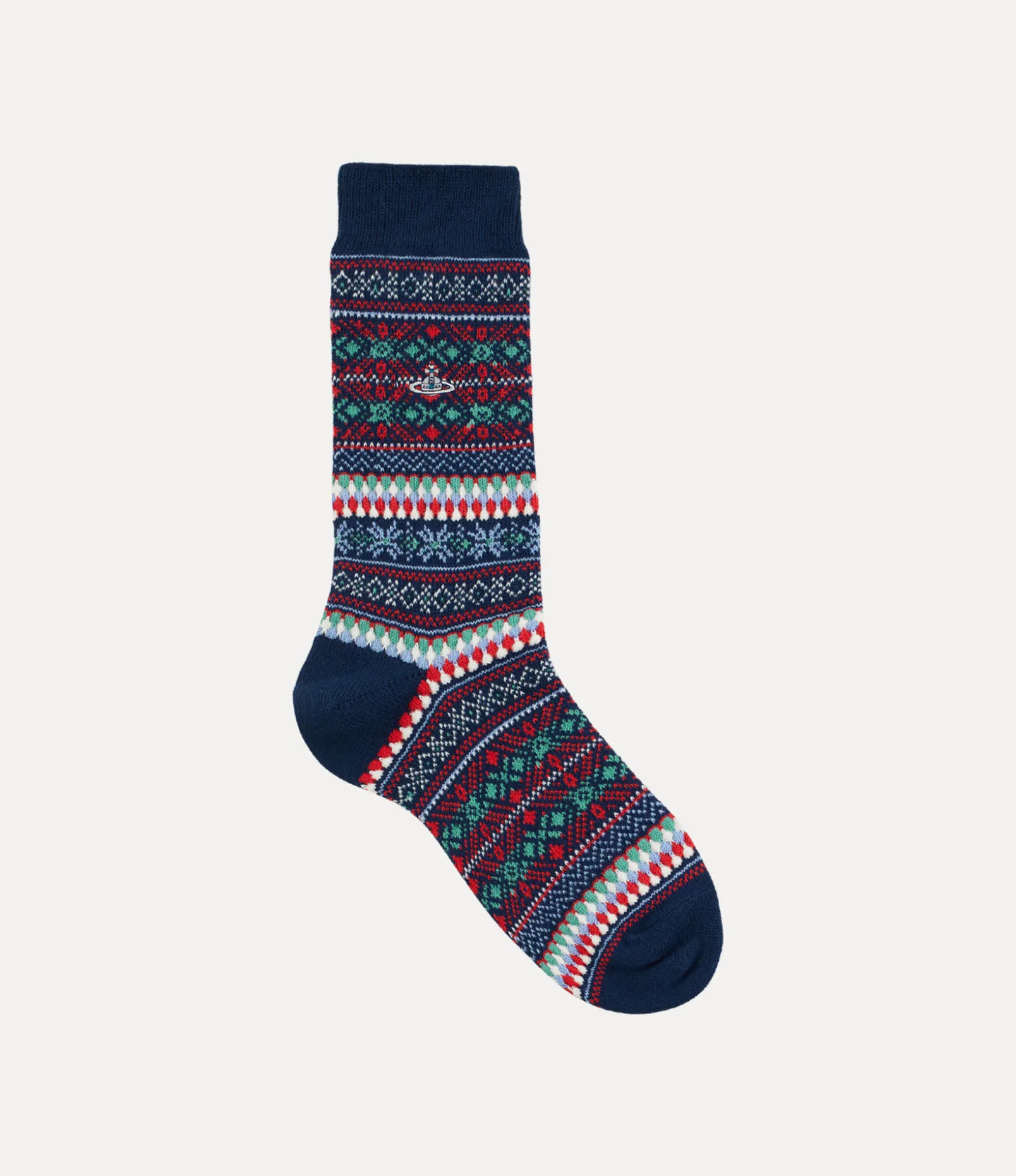 Our Menso socks showcase a classic knit design that originates from the Fair Isle in Scotland. The embroidered orb motif at the ankle, developed by Vivienne Westwood during the 1980s, to represent her vision of blending tradition with innovation.