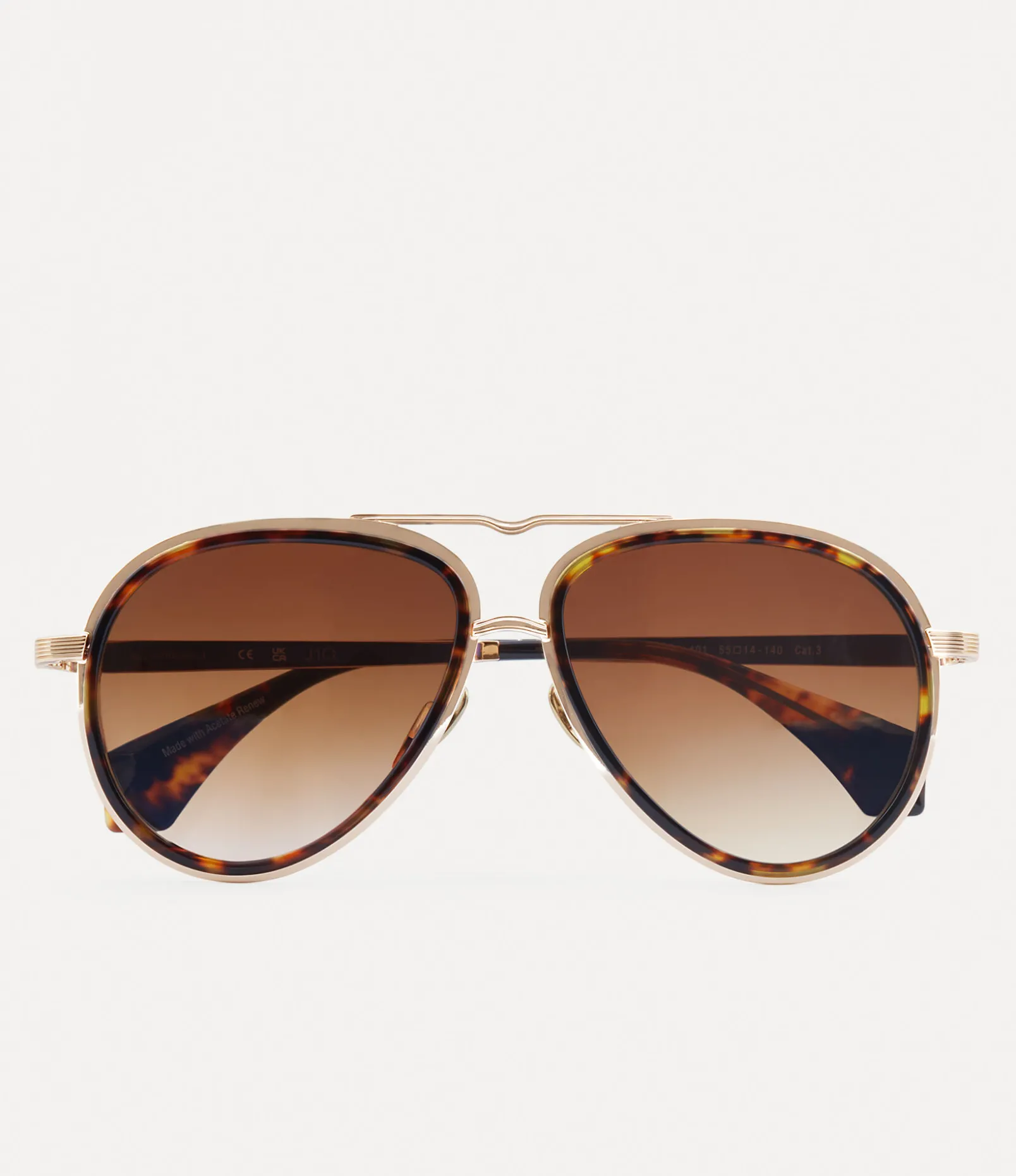 The defined aviator silhouette of our Cale sunglasses pays homage to the iconic styles worn by John Cale of the Velvet Underground during the 1970s. For this collection, we have introduced a brown tortoiseshell-effect frame with a double bridge, featuring gold-tone plating and our signature orb motif etched onto the temples, giving a modern feel to the retro aesthetic.