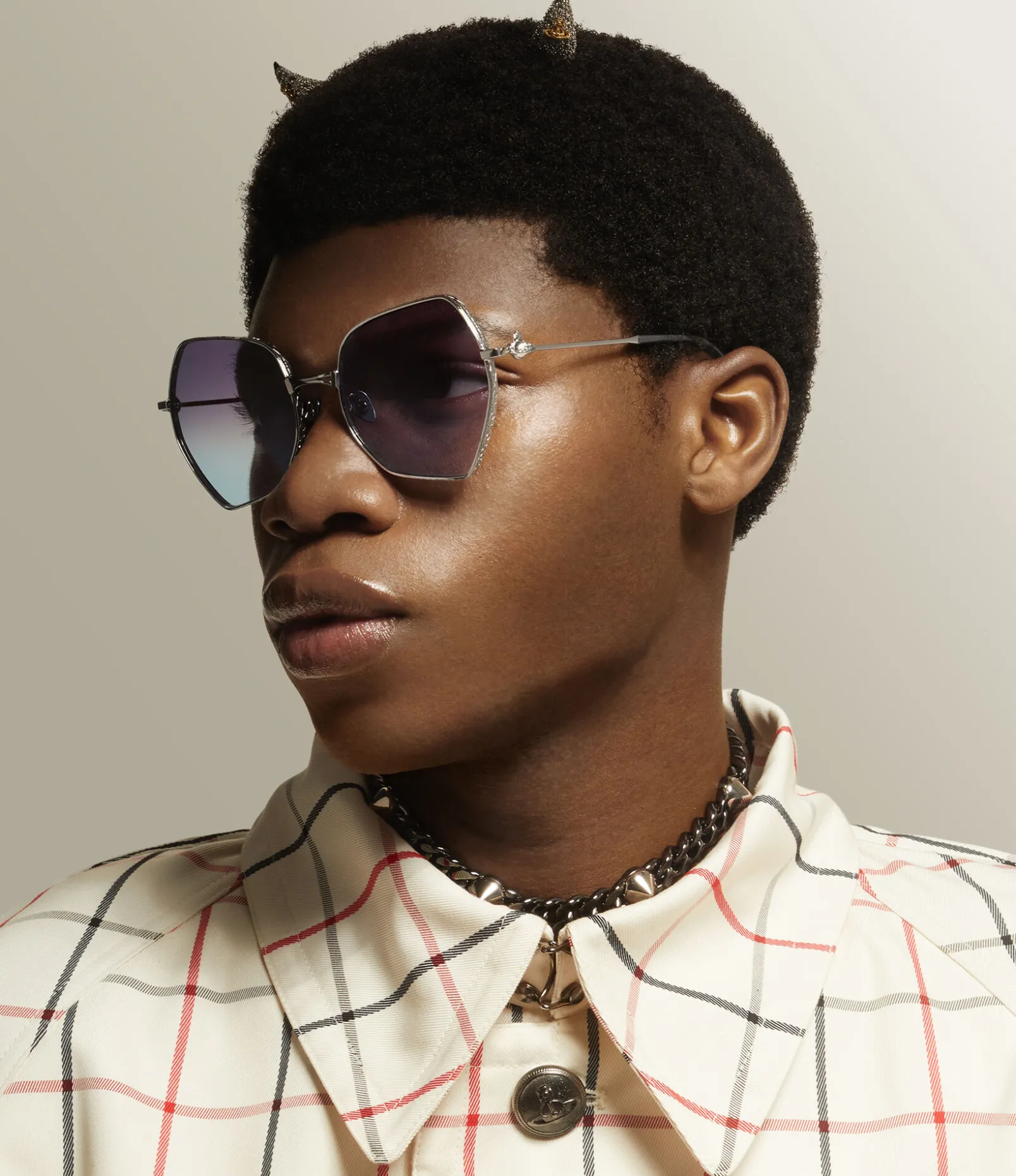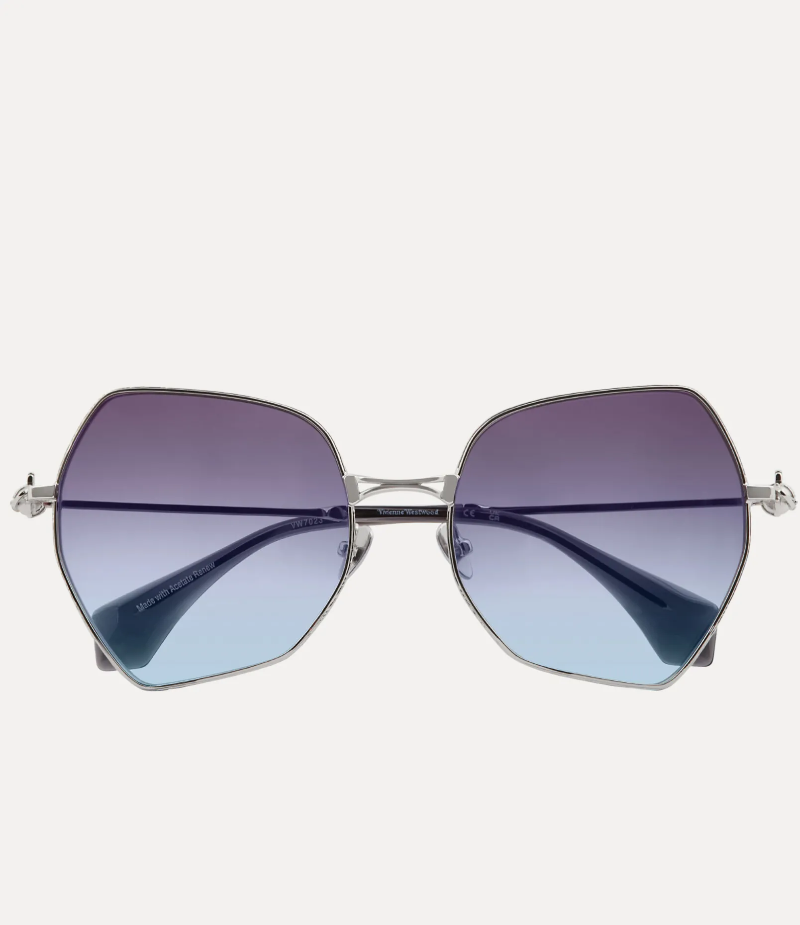 This season, our Hardware Orb sunglasses feature hexagonal frames and gradient blue lenses, inspired by Jodie Foster’s sunglasses in the film ‘Taxi Driver’. In contrast to the rounded edges and soft palette, the sunglasses’ silhouette is enhanced by our angular orb hinges – synonymous with Vivienne’s vision of taking tradition into the future.