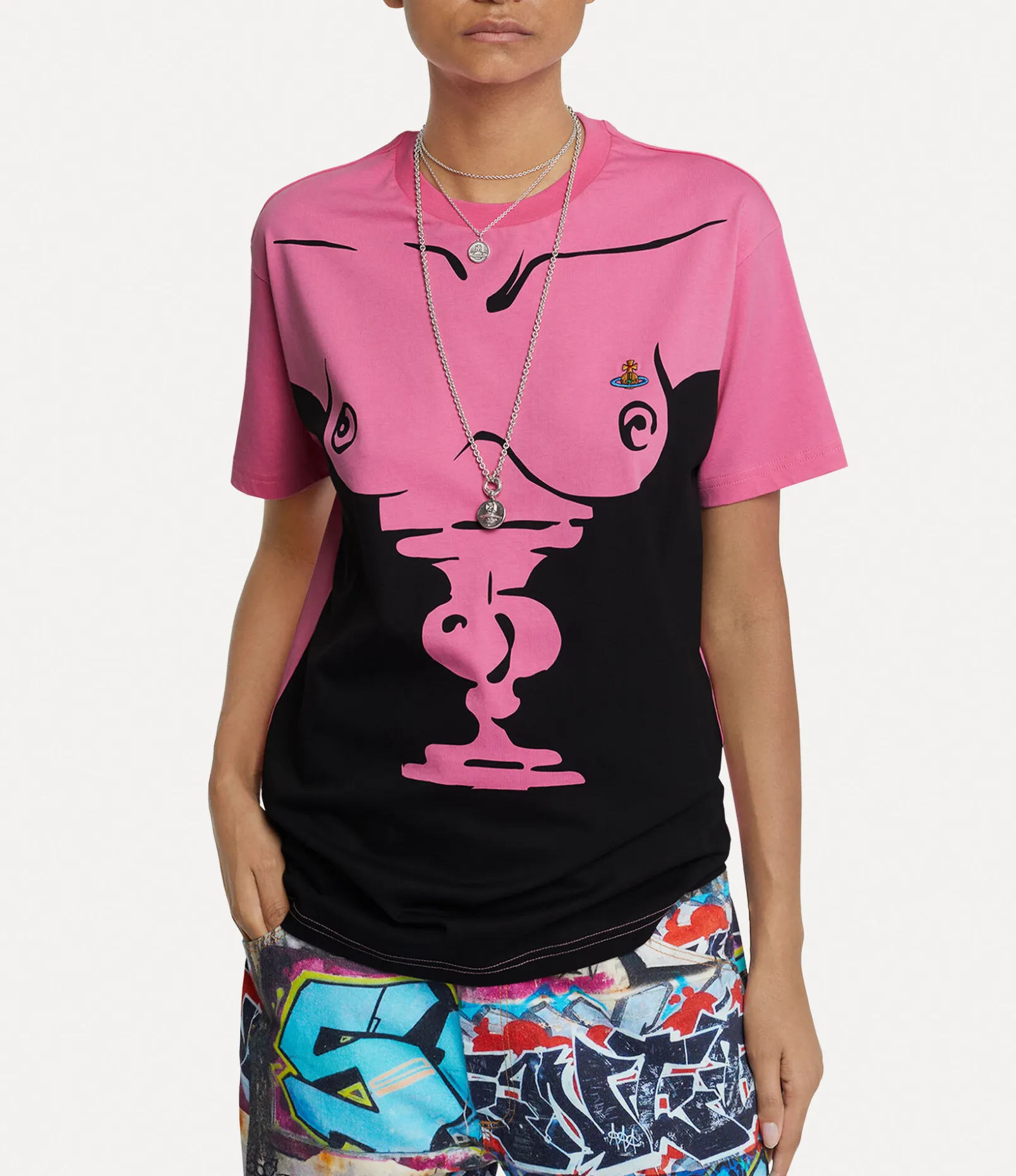 The Classic t-shirt for this season showcases a bust artwork inspired by Vivienne Westwood’s Autumn-Winter 1992-93 collection, ‘Portrait’. The signature orb embroidery is elegantly displayed on the left side of the design, reflecting Vivienne Westwood’s unique perspective of blending tradition with innovation.