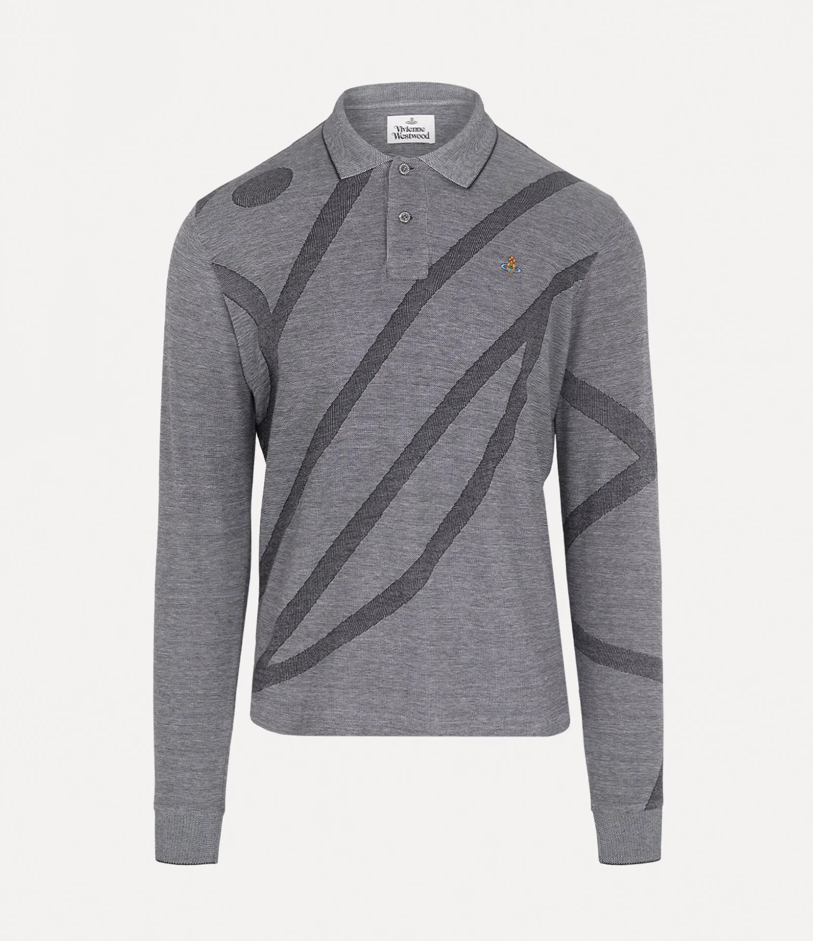 The house’s orb silhouette is synonymous with Vivienne’s vision of launching tradition into the future. This season’s Long Sleeve Polo top receives a printed orb jacquard, which has been enlarged to envelop the design, adorned with an multicoloured orb embroidery on the left-hand side of the chest.