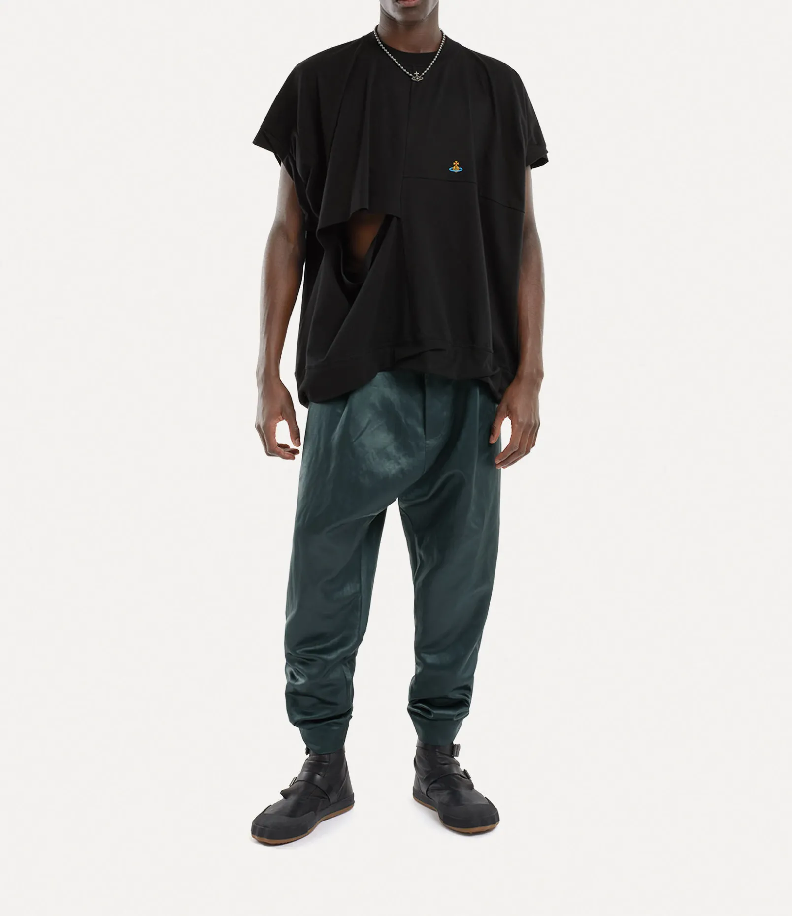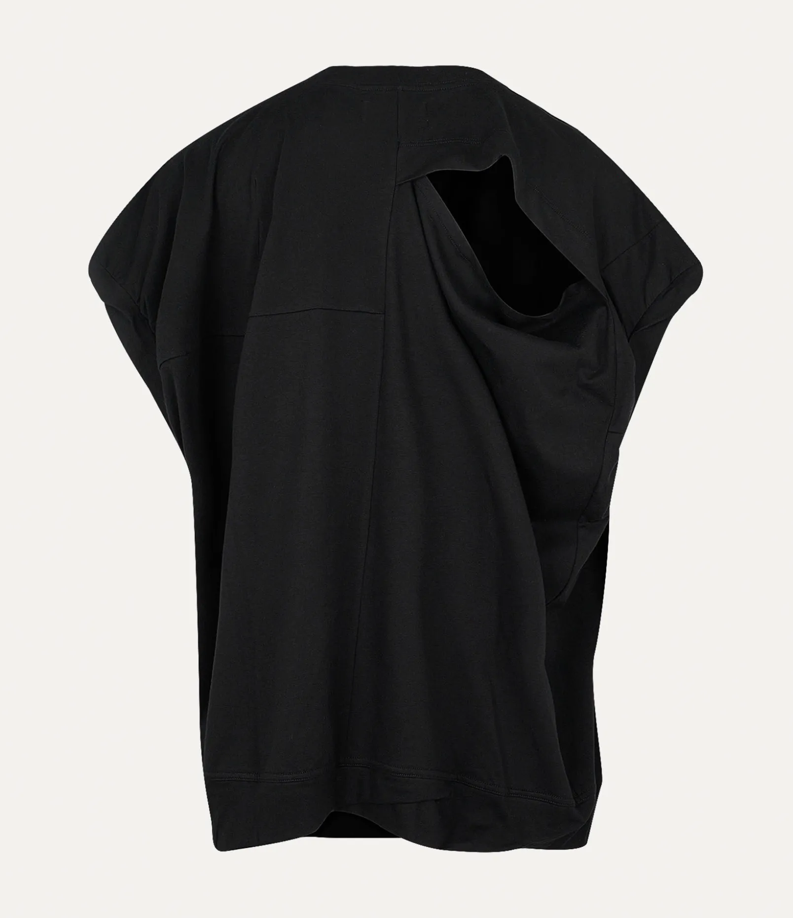 Our Twisted Sleeveless Dolly t-shirt with twisted silhouette is generously cut from cotton panels and features slash detailing, reminiscent of Vivienne Westwood’s ‘Cut, Slash and Pull’ collection for Spring-Summer 1990. The multicoloured embroidery on the left-hand side of the chest is inspired by our iconic orb logo, first appearing over 28 years ago in the Harris Tweed Autumn-Winter 1987-88 collection.