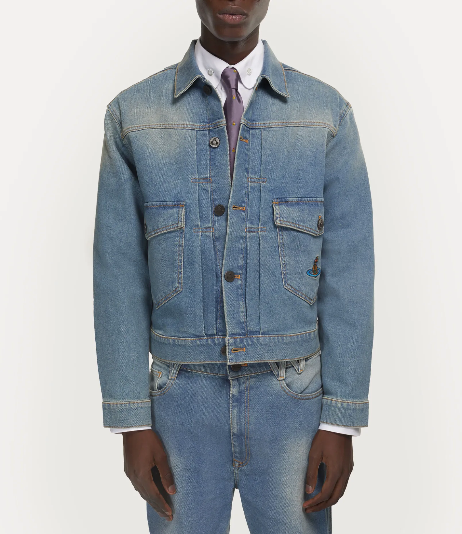 This season, our tie features the iconic orb detail in a jacquard pattern, synonymous with Vivienne’s vision of launching tradition into the future. The piece features a wide-blade silhouette, complete with a classic keeper loop at the back.