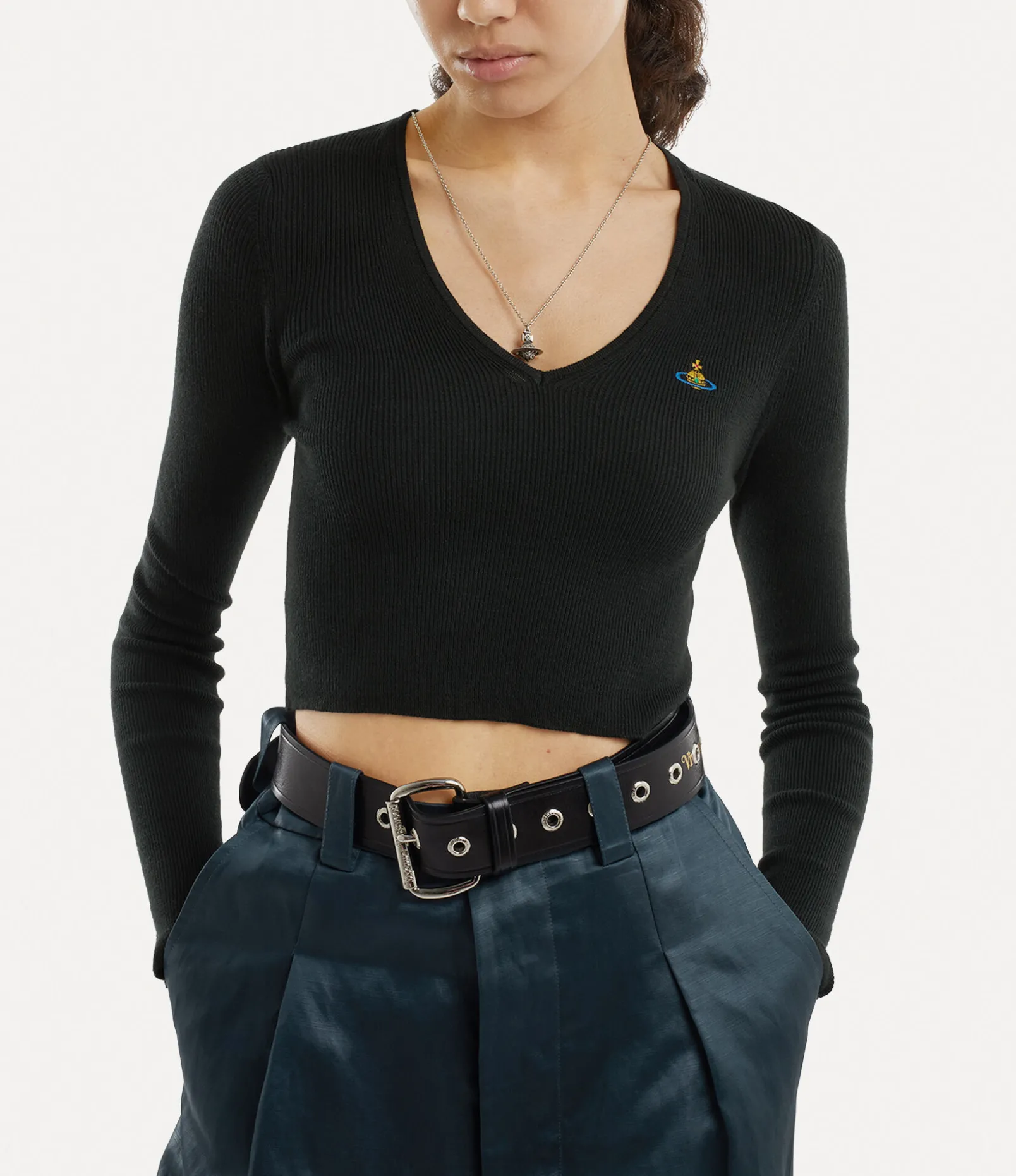 Our Bea Cropped V-neck top is a new development of the ‘Bea Cropped’ cardigan, from the classic Vivienne Westwood collection. The piece features an all-over ribbed silhouette in a cotton-cashmere finish, complete with a multicoloured orb embroidery on the left-hand side of the chest – synonymous with Vivienne’s vision of taking tradition into the future.