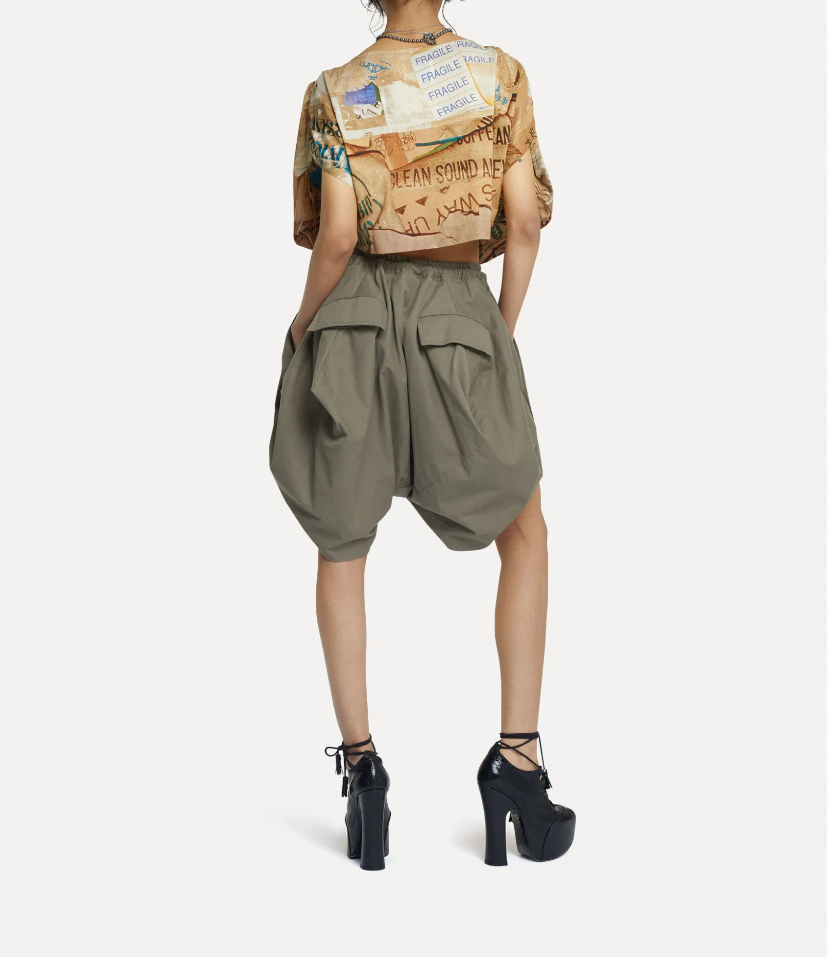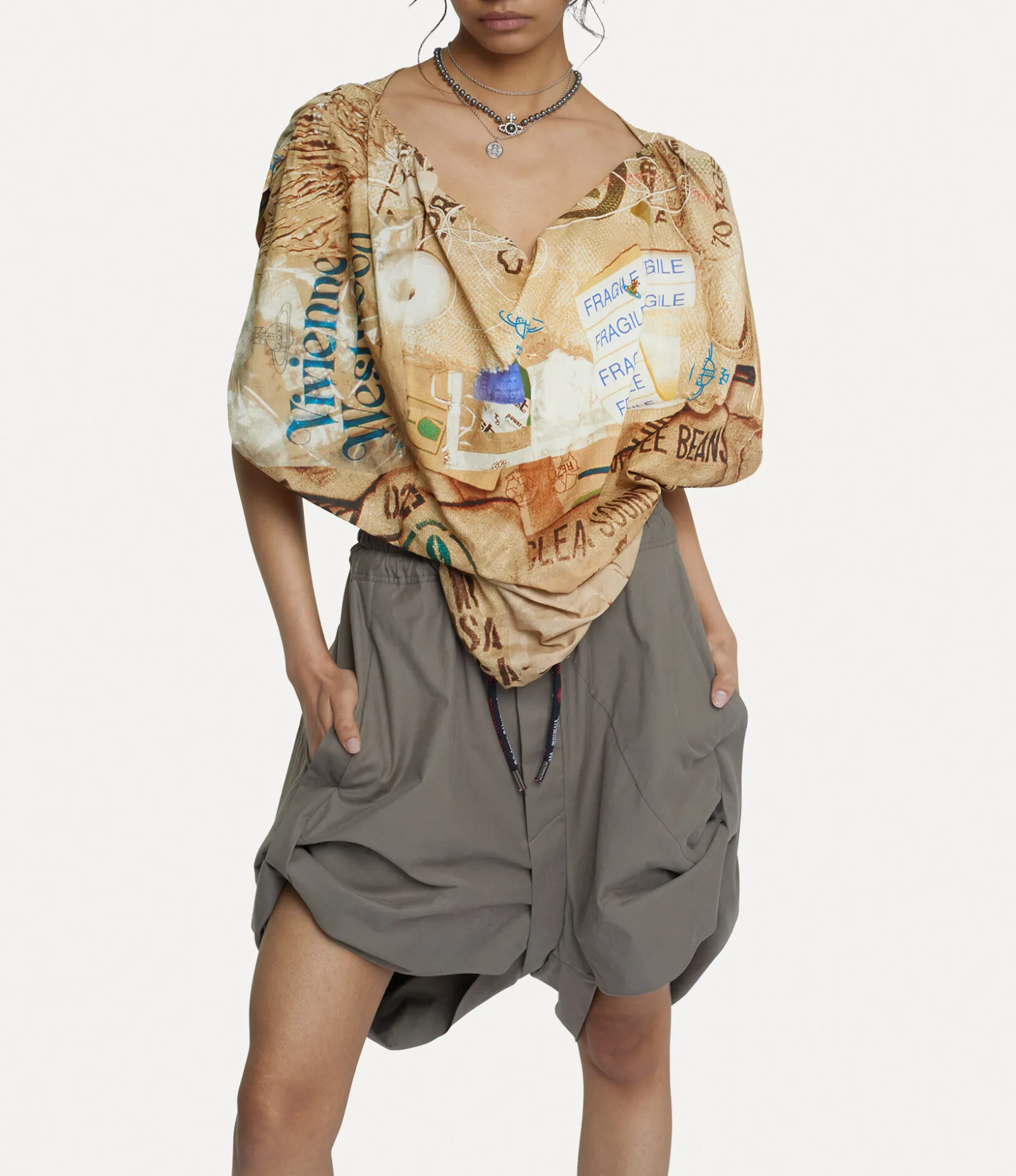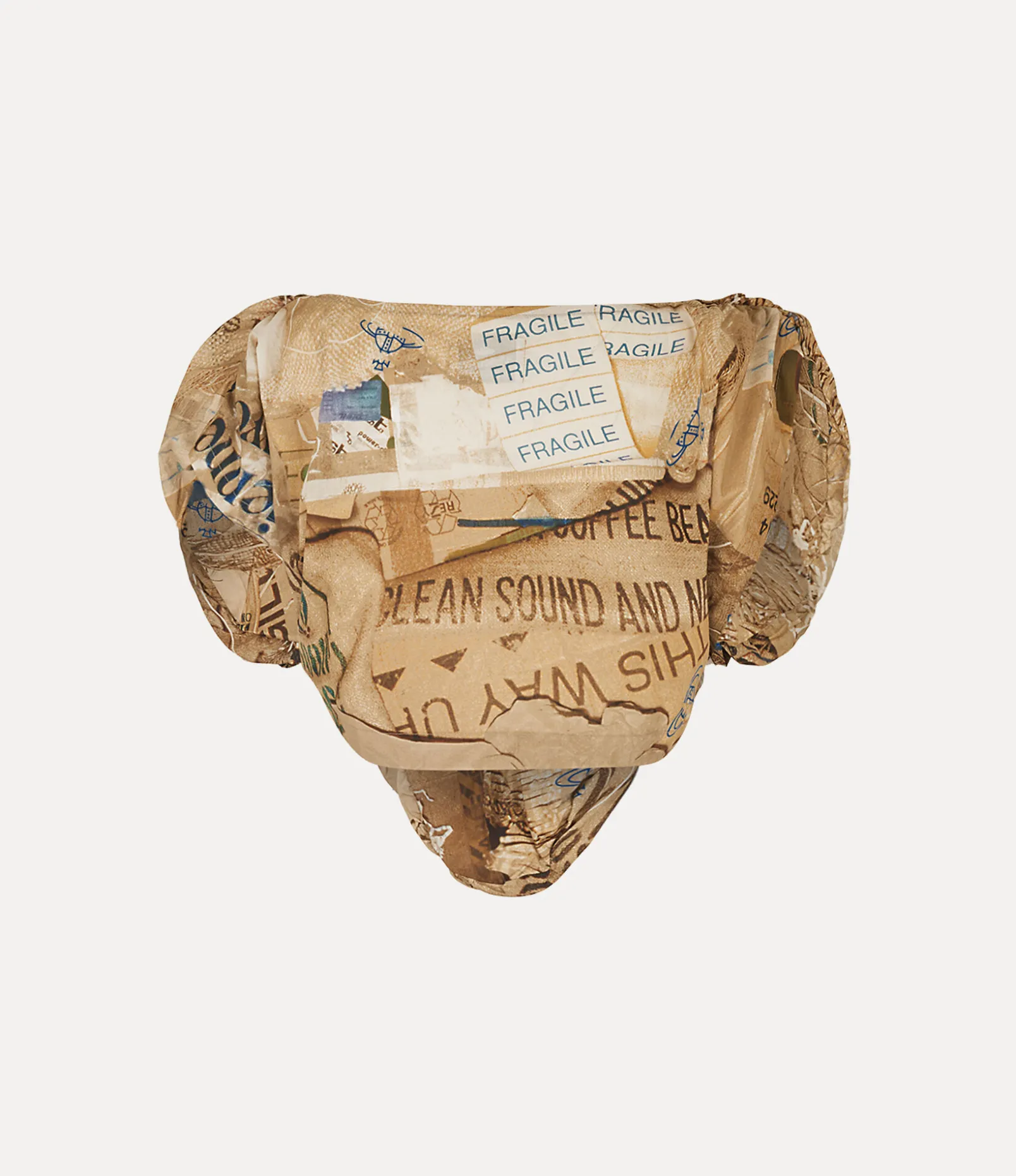 The asymmetric heart shape, a signature style of the house, is revived with this season’s Heart top – which Vivienne used to evoke an affection for the planet. The piece is complete with the ‘Rubbish’ motif, featuring a collage of packaging waste, recalling the concept of upcycling newspapers by using them to wrap valuable ornaments when moving house.