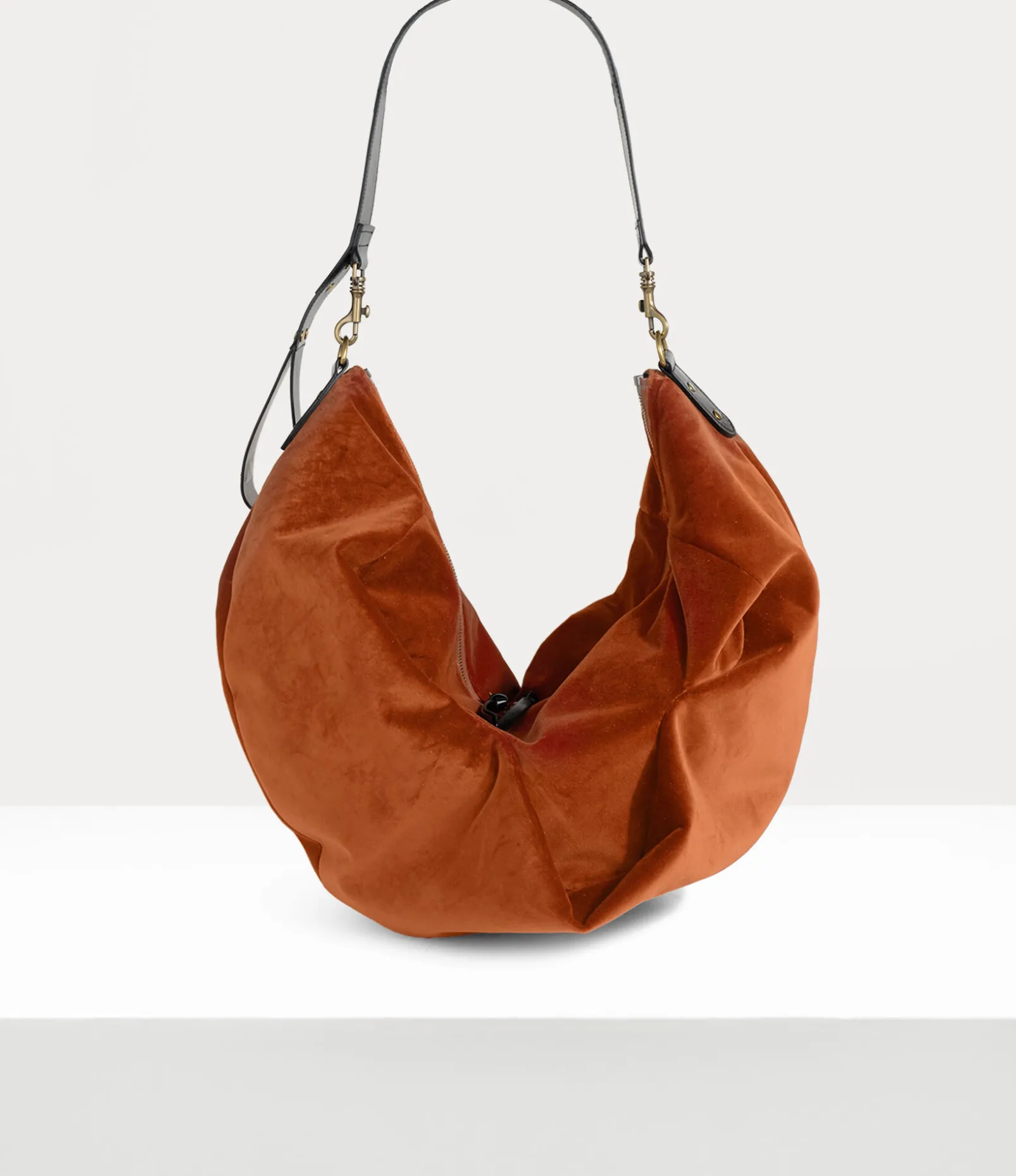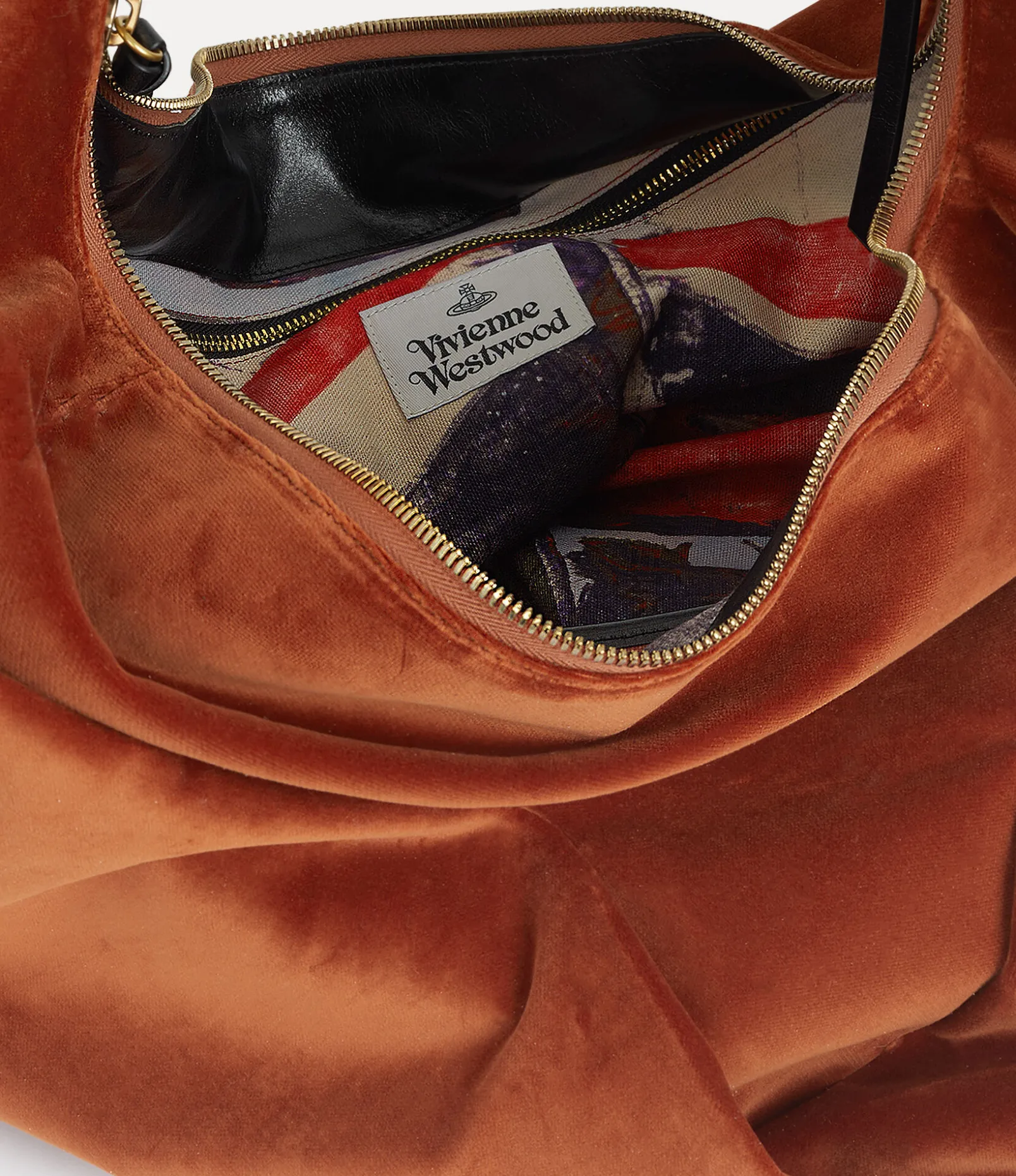 Our Large Agnes Shoulder bag features a unique pattern cutting system inspired by the Autumn-Winter 2001 ‘Wild Beauty’ collection, complete with drapery at the front and a curved silhouette. The handle is reminiscent of the bondage whips sold in our iconic Sex boutique, while the orb-branded strap recalls Vivienne’s vision of launching tradition into the future.