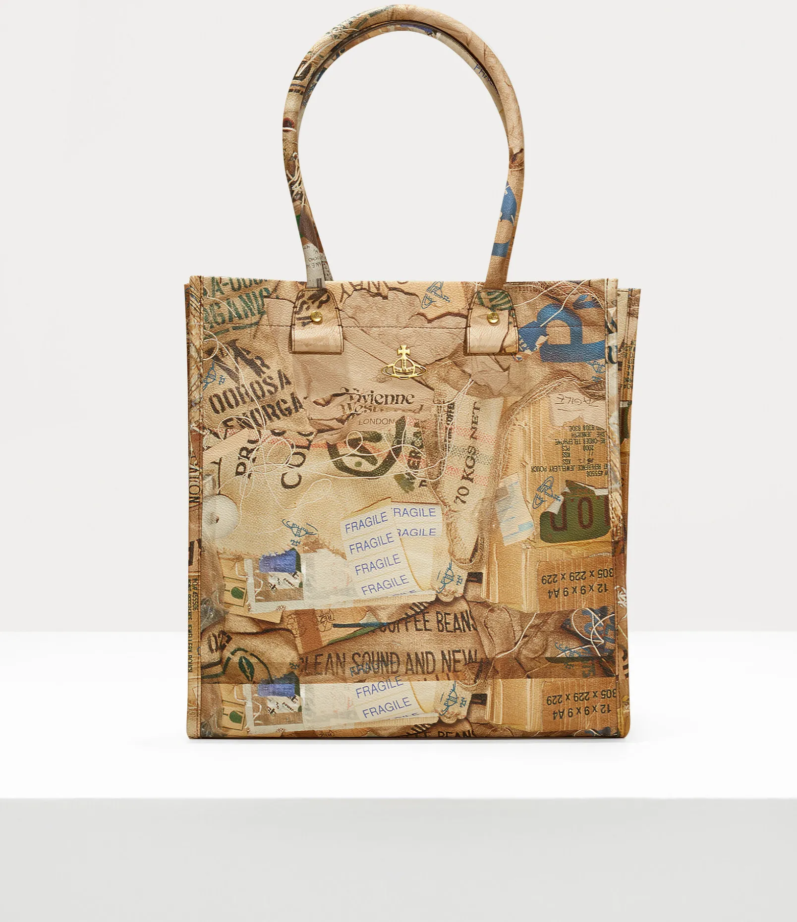 The Teddy tote bag in soft PU leather features a top-handle silhouette, complete with extendable gussets on either side of the design. The piece receives our archive ‘Rubbish’ motif, a collage of packaging and cardboard images – evoking the concept of upcycling newspapers by using them to wrap valuable ornaments when moving house.