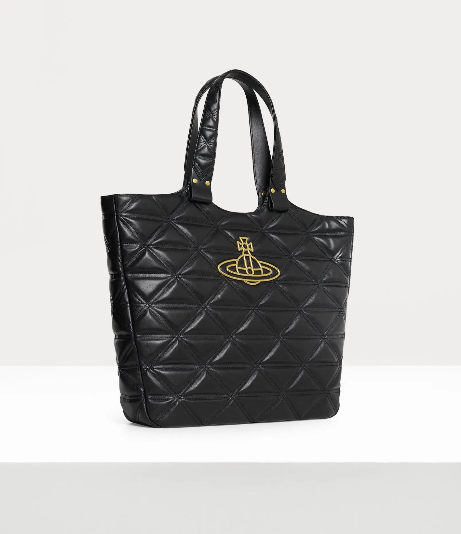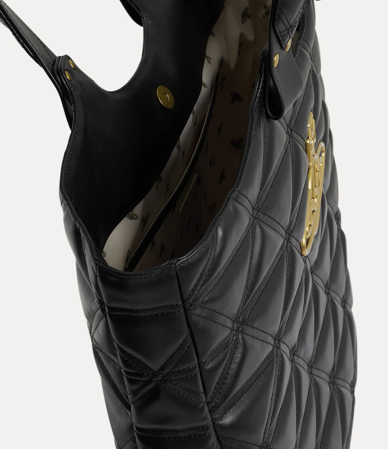 Our Talitha tote bag features our archive ‘Harlequin’ quilting, first introduced in the Vivienne Westwood Autumn-Winter 1989 ‘Voyage to Cythera’ collection. The piece borrows the ‘Baby Orb’ lining from our Spring-Summer 2023 range, finished with a brass-plated orb on the front panel – synonymous with Vivienne’s vision of launching tradition into the future.