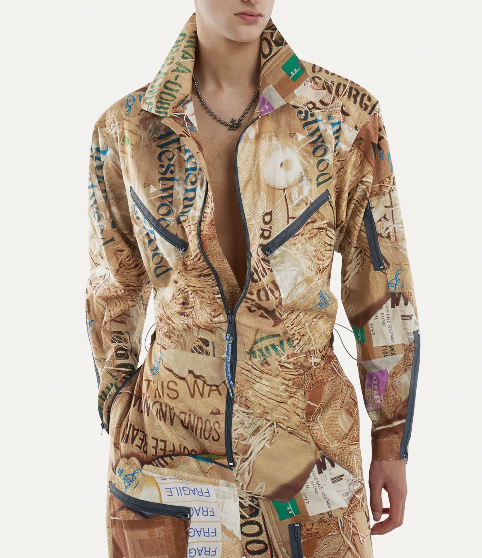 Our Joan jumpsuit was first seen in the Vivienne Westwood Autumn-Winter 2020-2021 collection. This season, the piece receives a central zip puller adorned with an orb-printed shoelace, complete with our archival ‘Rubbish’ motif, reminiscent of packaging materials and cardboard waste.