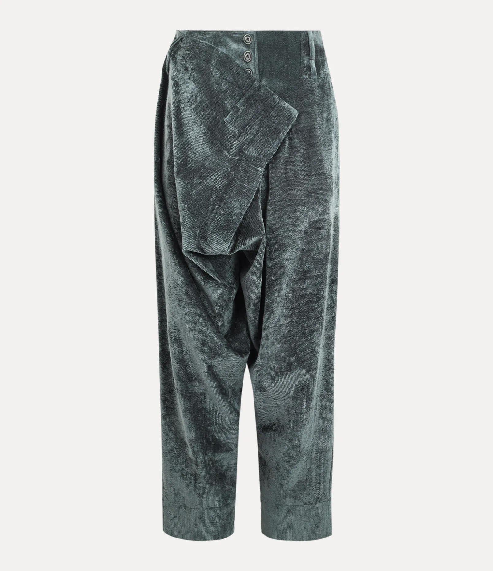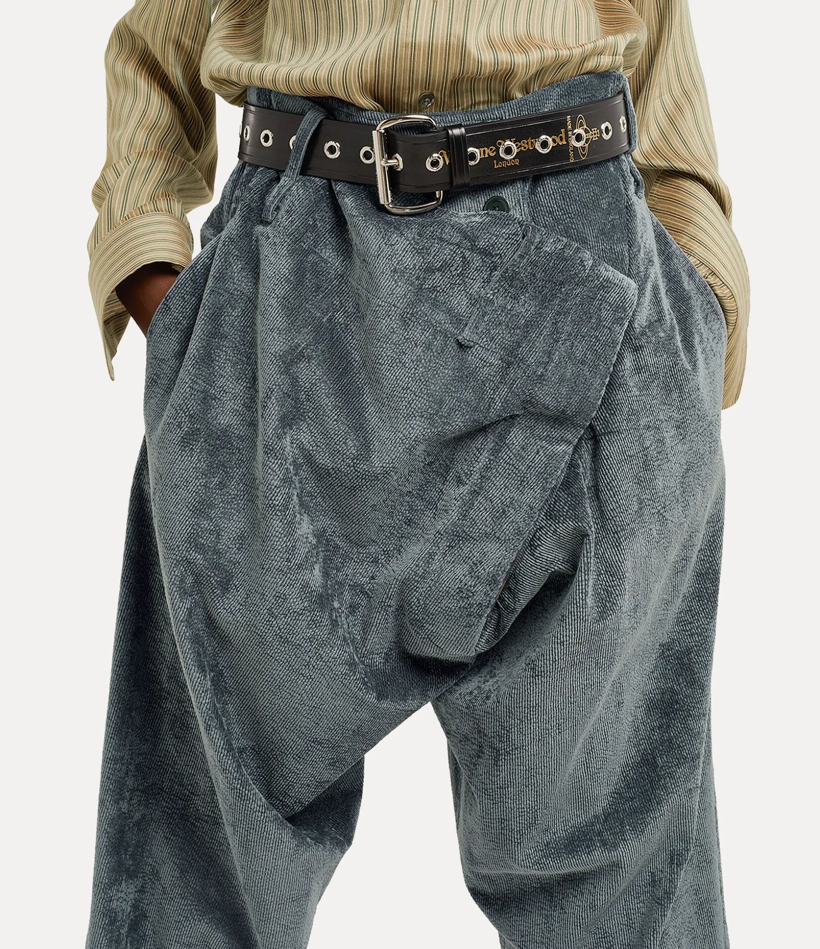 The Inferno Trousers from the Andreas Kronthaler for Vivienne Westwood collection are designed from a crushed corduroy fabric, giving the piece its unique irregular texture. Reviving our iconic ‘Drunken’ tailoring system, the piece features an asymmetric front closure, creating an intricately distorted draped effect that embodies the house’s punk aesthetic.