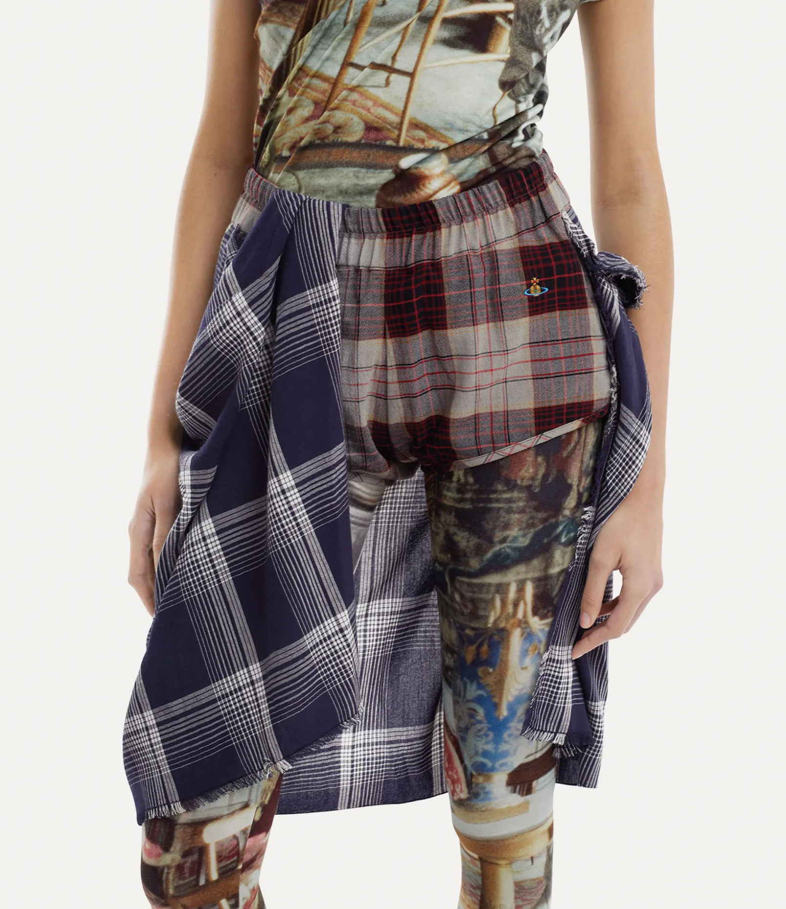Tartan remains an essential element of the house’s heritage, emulating a sense of bygone luxury and non-conformity, reminiscent of our house’s signature punk style. The Chippendale shorts feature a mixed tartan motif, complete with an embroidered orb emblem – synonymous with Vivienne’s vision of taking tradition into the future.