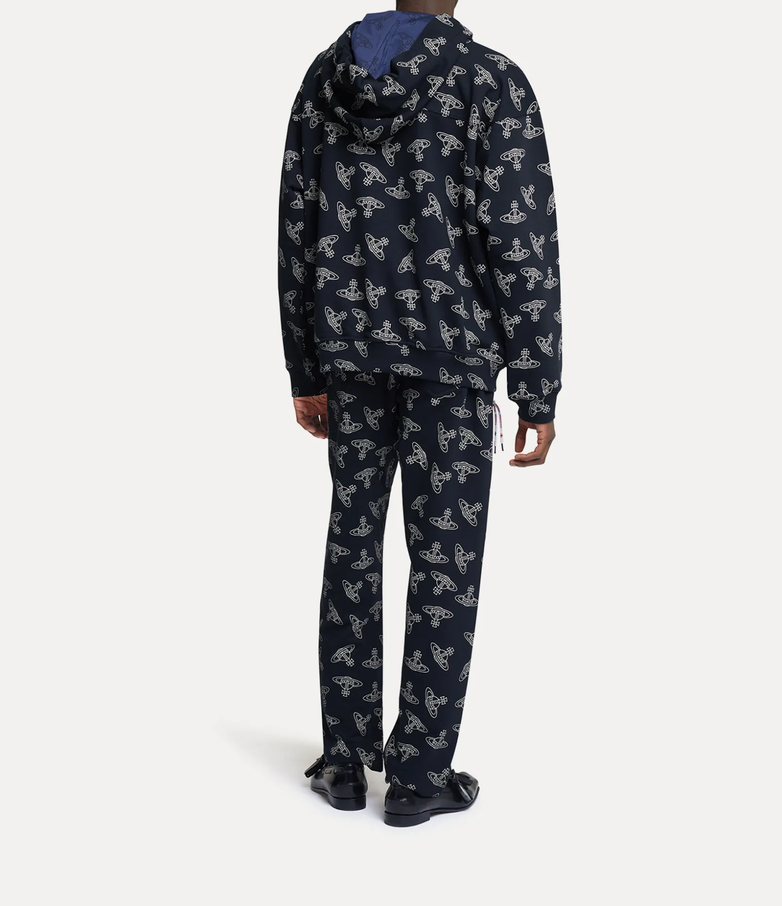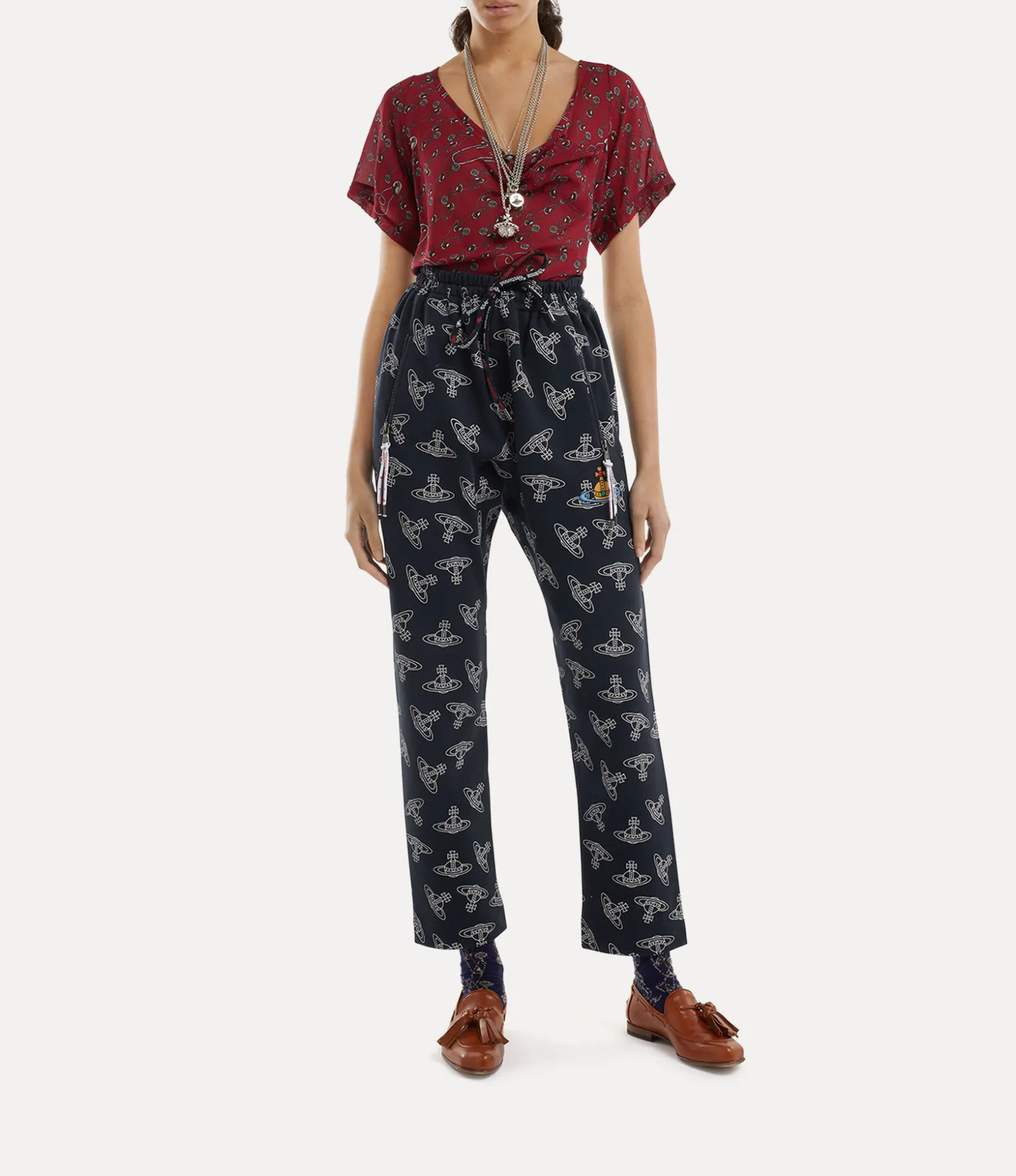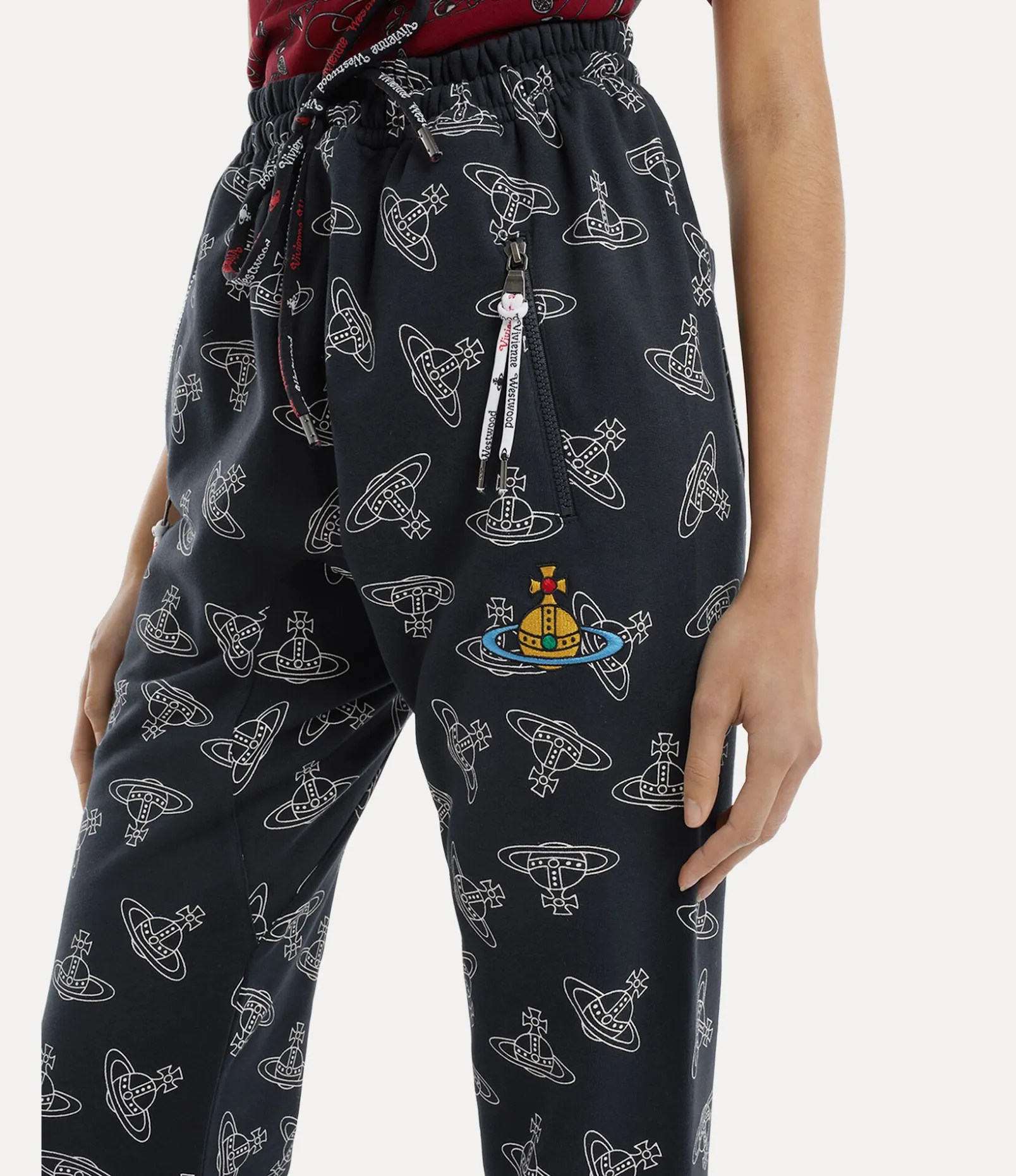 Our Football trousers take inspiration from football culture and receive a lowered crotch seam with shoelace fastenings, patterned with this season’s orb jacquard across the design. The piece features the houses vibrant multicoloured orb embroidery on the left-hand side, embodying Vivienne’s innovative blend of tradition and modernity.