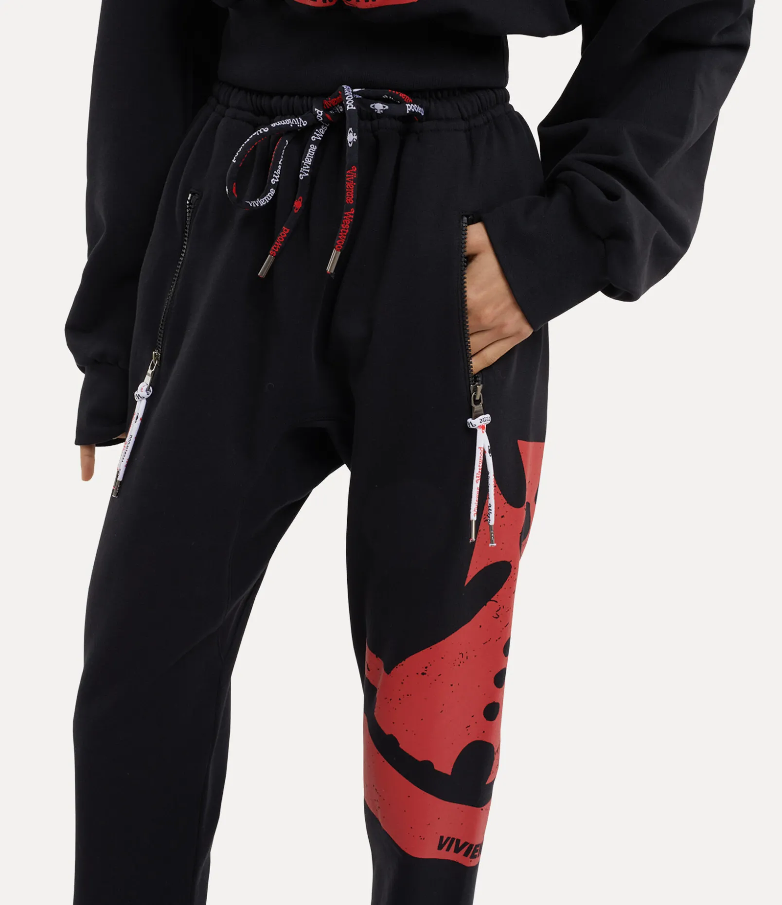 Our Football trousers feature an elasticated drawstring waistband, branded with the house’s orb and lettering motif. The football-inspired drop crotch seam falls into a tapered finish, printed with our ‘Sunken Orb’ logo detail on one leg – synonymous with Vivienne’s vision of launching tradition into the future.