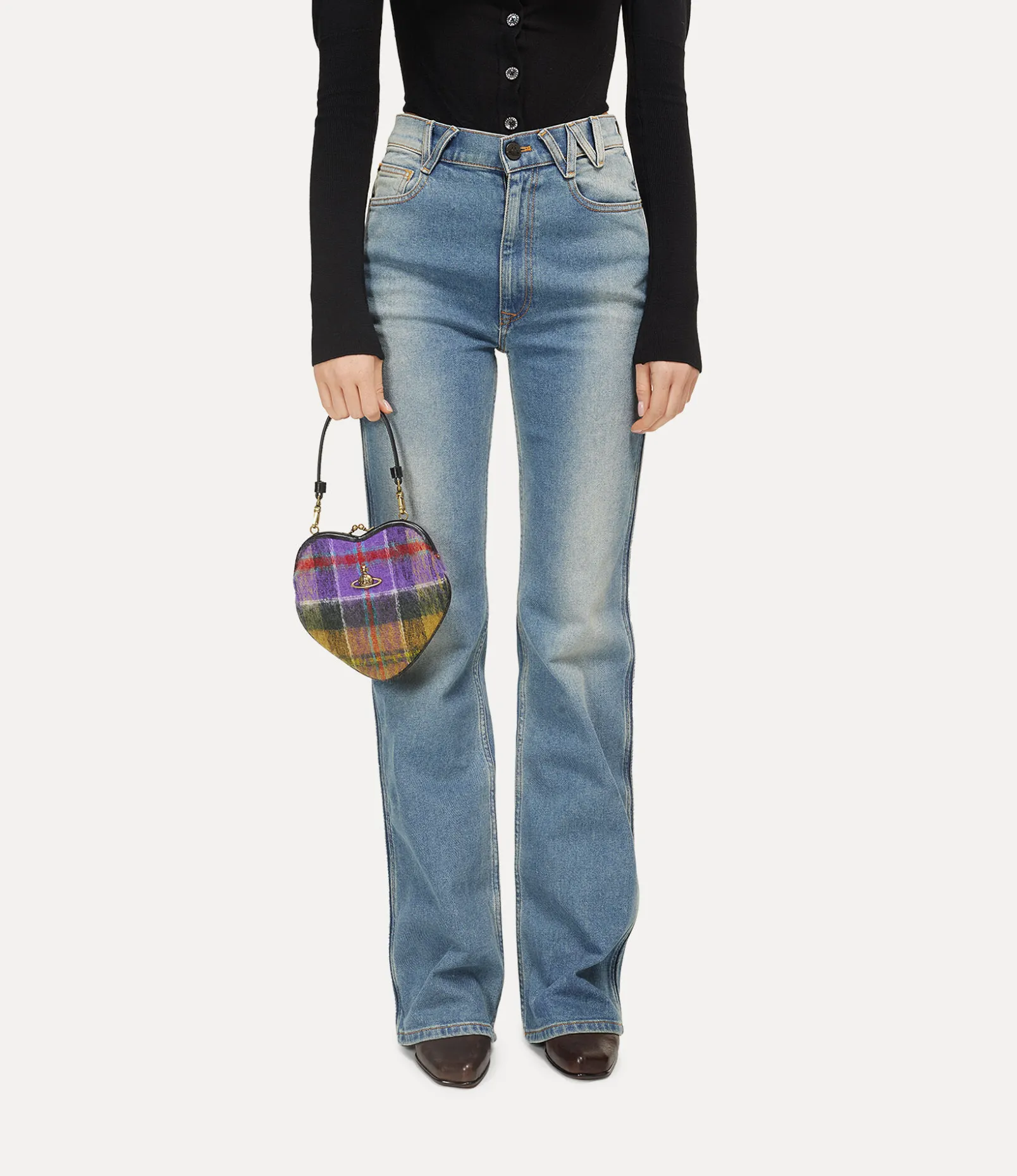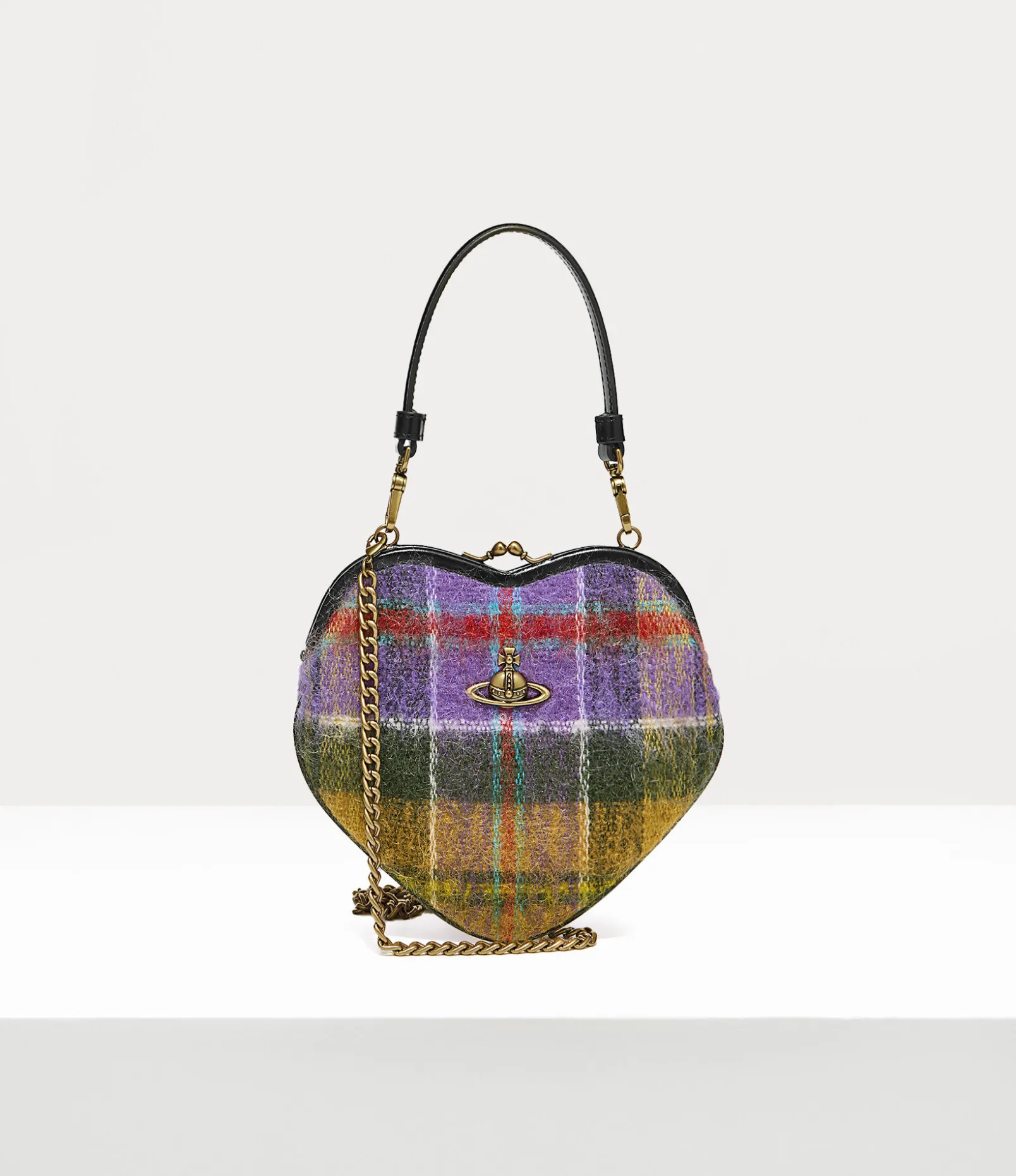 The Lochcarron of Scotland tartan motif, which emphasises the Neo-classical inspirations of the collection, can be found across the Vivienne Westwood Belle Heart Frame purse this season. The style receives a cotton ‘Broken Pinstripe’ interior lining, a unique twist on the traditional pinstripe, complete with a brass orb plaque on the front panel – synonymous with Vivienne’s vision of launching tradition into the future.
