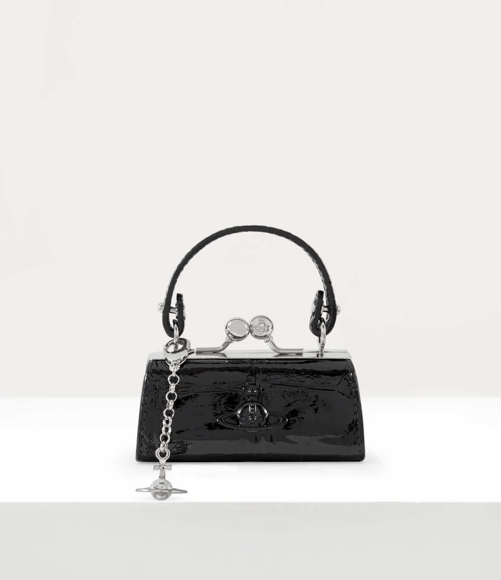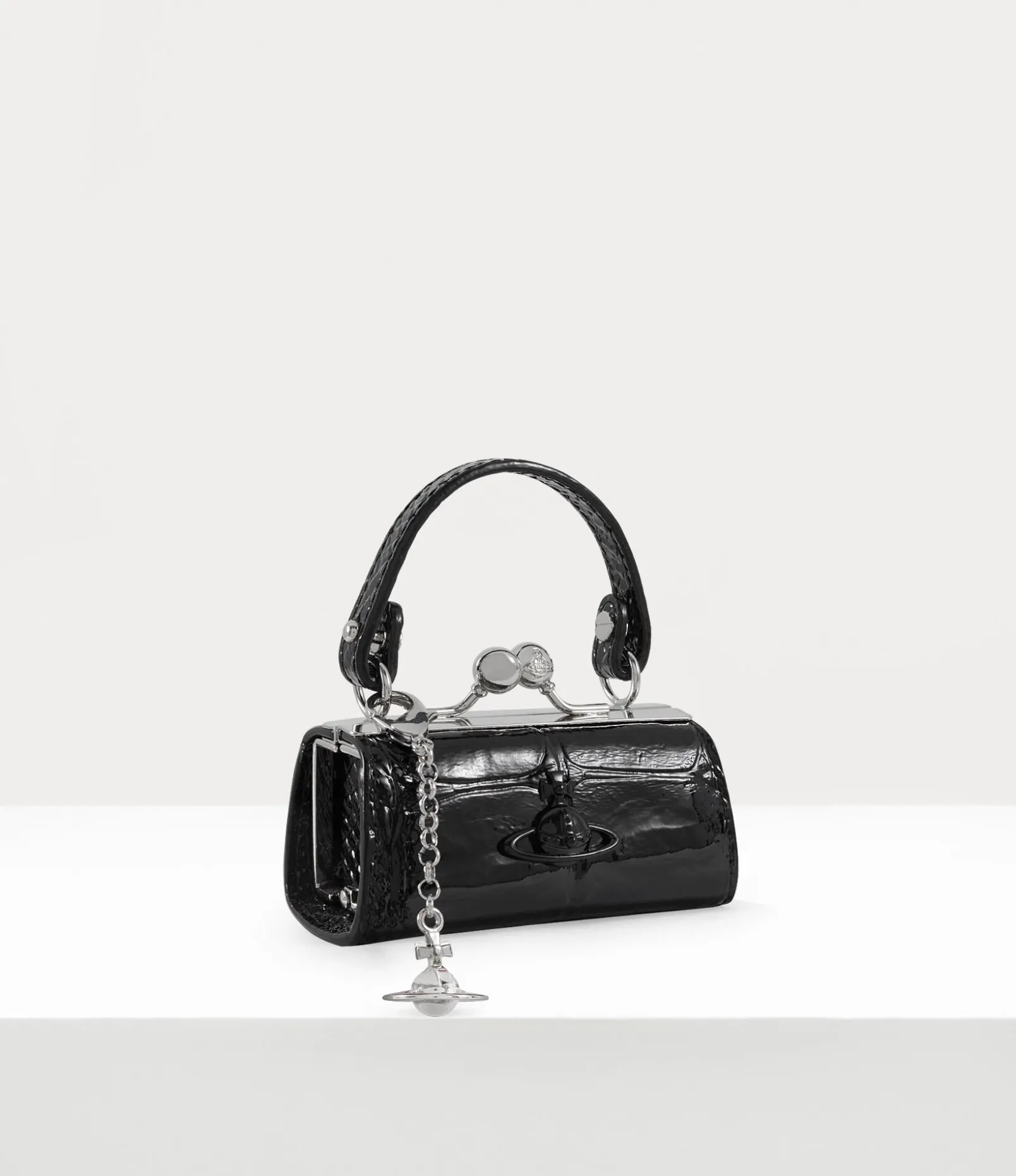 Our Doll bag features a patent leather finish, reminiscent of the liquid latex and rubberwear sold in our iconic Sex boutique. The miniature silhouette draws inspiration from toy doll bags, featuring an intricately engraved kiss lock closure and our dangle orb motif, symbolising Vivienne Westwood’s idea of taking tradition into the future.