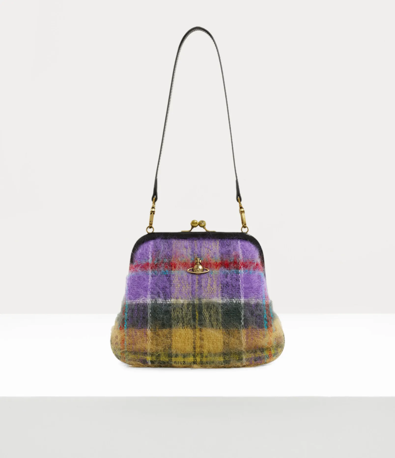 Named after Vivienne Westwood, this season’s Vivienne’s clutch features an intricate kiss-lock closure, reminiscent of early 20th-century antique coin purses, complete with antique gold plating. The piece receives a tartan mohair finish, capturing the essence of Scotland’s rugged landscape, created using a brushed effect technique.