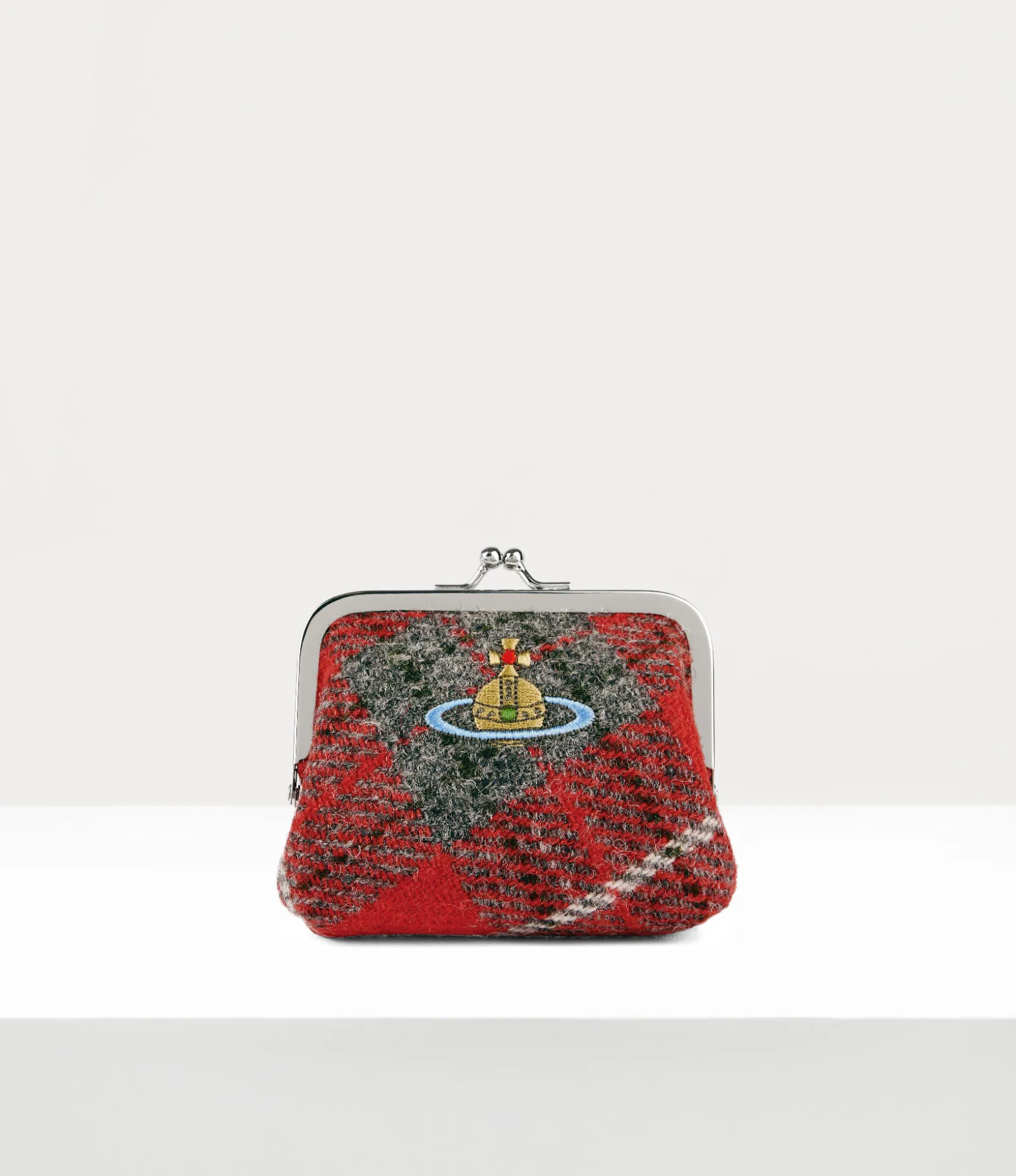 Our Frame Coin purse features a vintage-inspired silhouette, complete with a kiss-lock closure, reminiscent of early 20th-century antique coin purses. The piece receives Harris Tweed tartan pattern, sourced from Lochcarron of Scotland, complete with an embroidered orb on the front panel – alluding to Vivienne’s vision of taking tradition into the future.