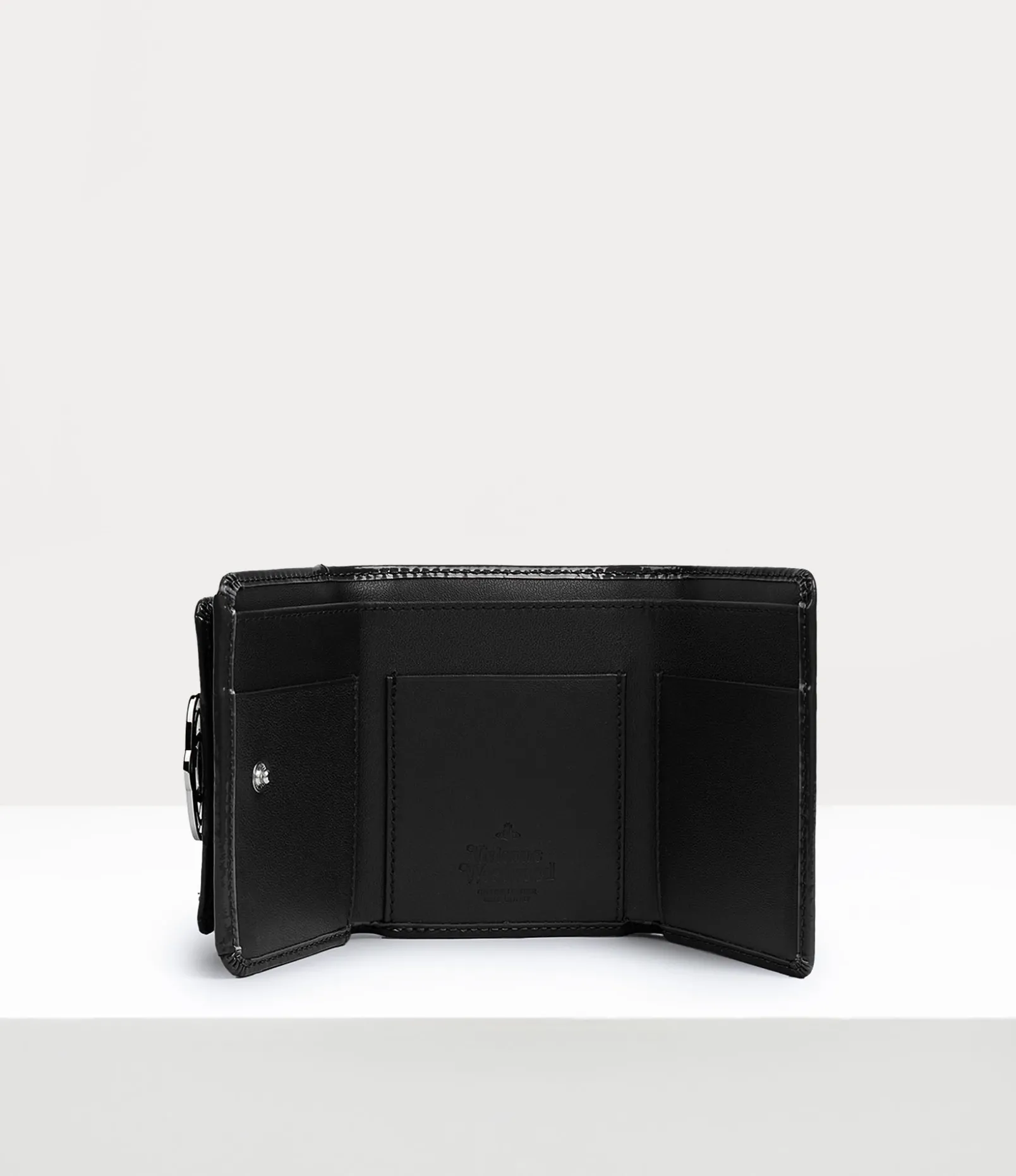 The Shiny Patent Small Flap purse is made in Italy from patent and is shaped to a rectangular silhouette. Featuring a classic trifold design, it is embossed with ‘Vivienne Westwood’ on the card slot.