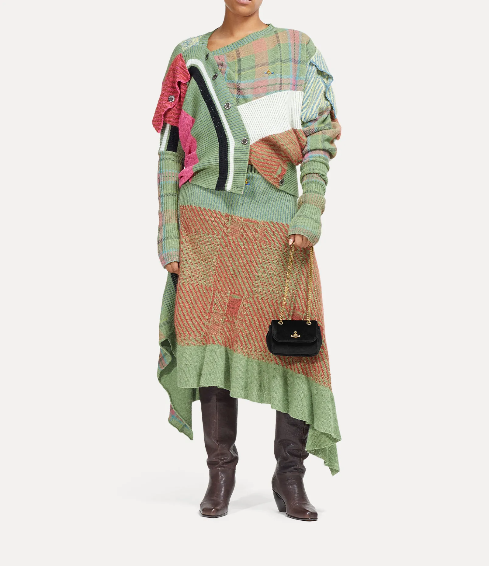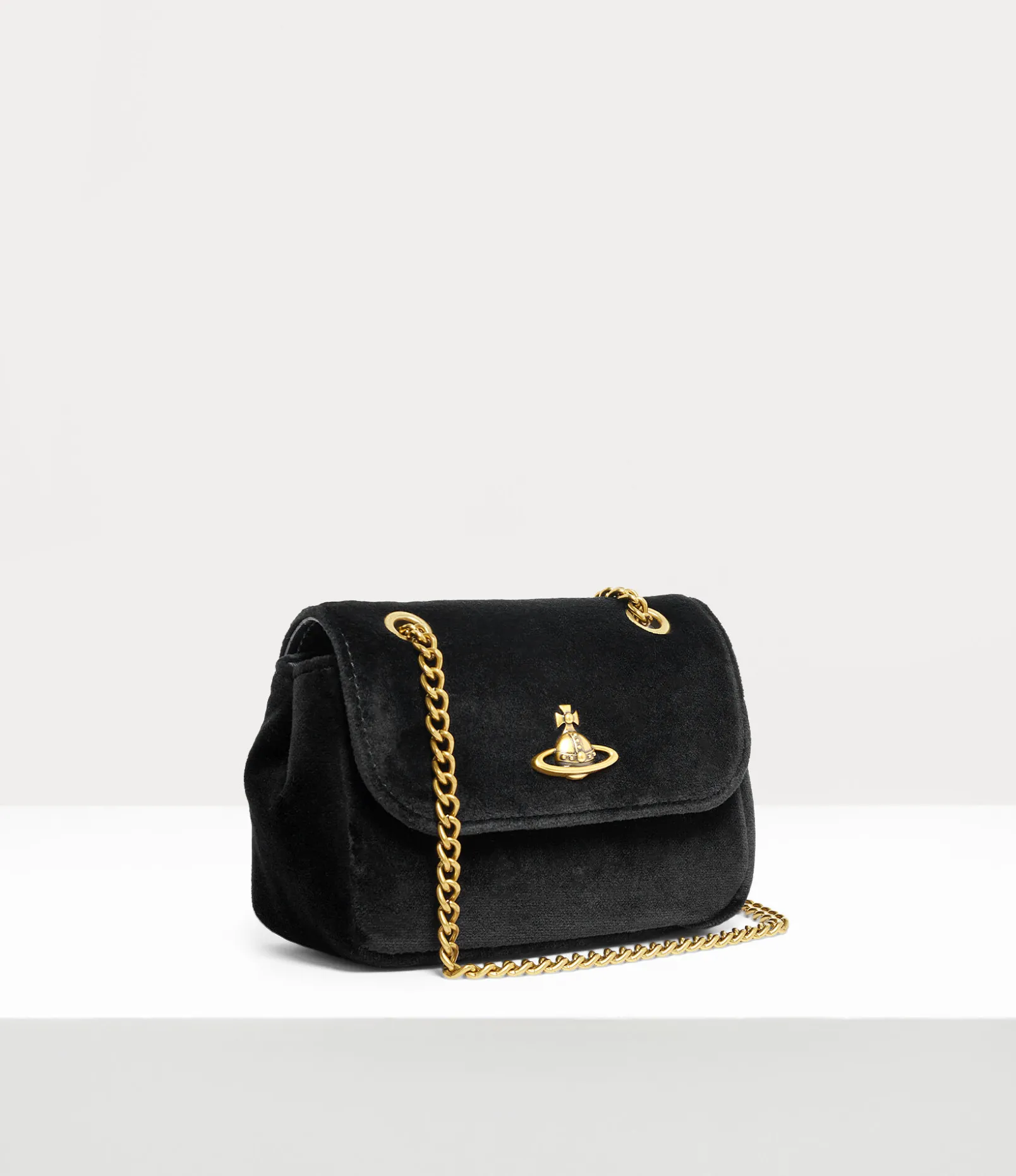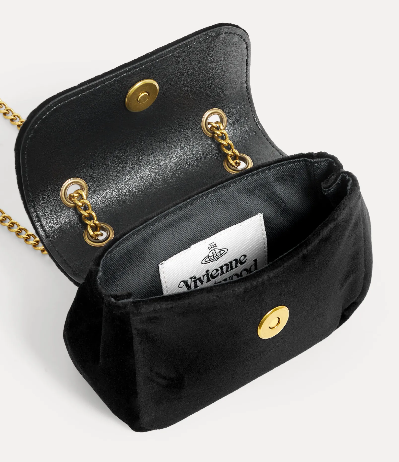 Our Small purse receives a rectangular silhouette, complete with a classic brass chain and an antique gold-tone orb plaque on the magnetic closure – recalling Vivienne’s vision of launching tradition into the future. The piece adopts a soft cotton velvet finish, paying homage to the opulent furniture of the early 19th century, a key influence for this season’s collection.