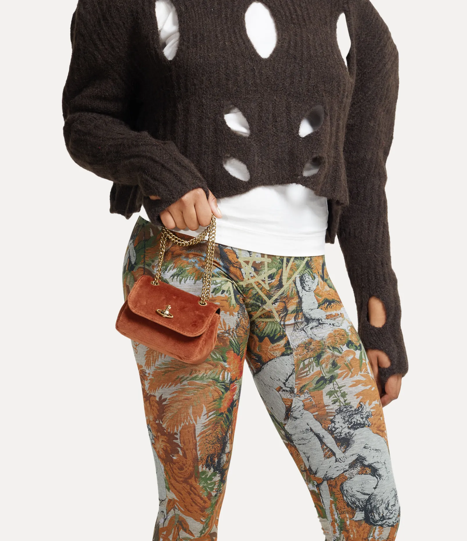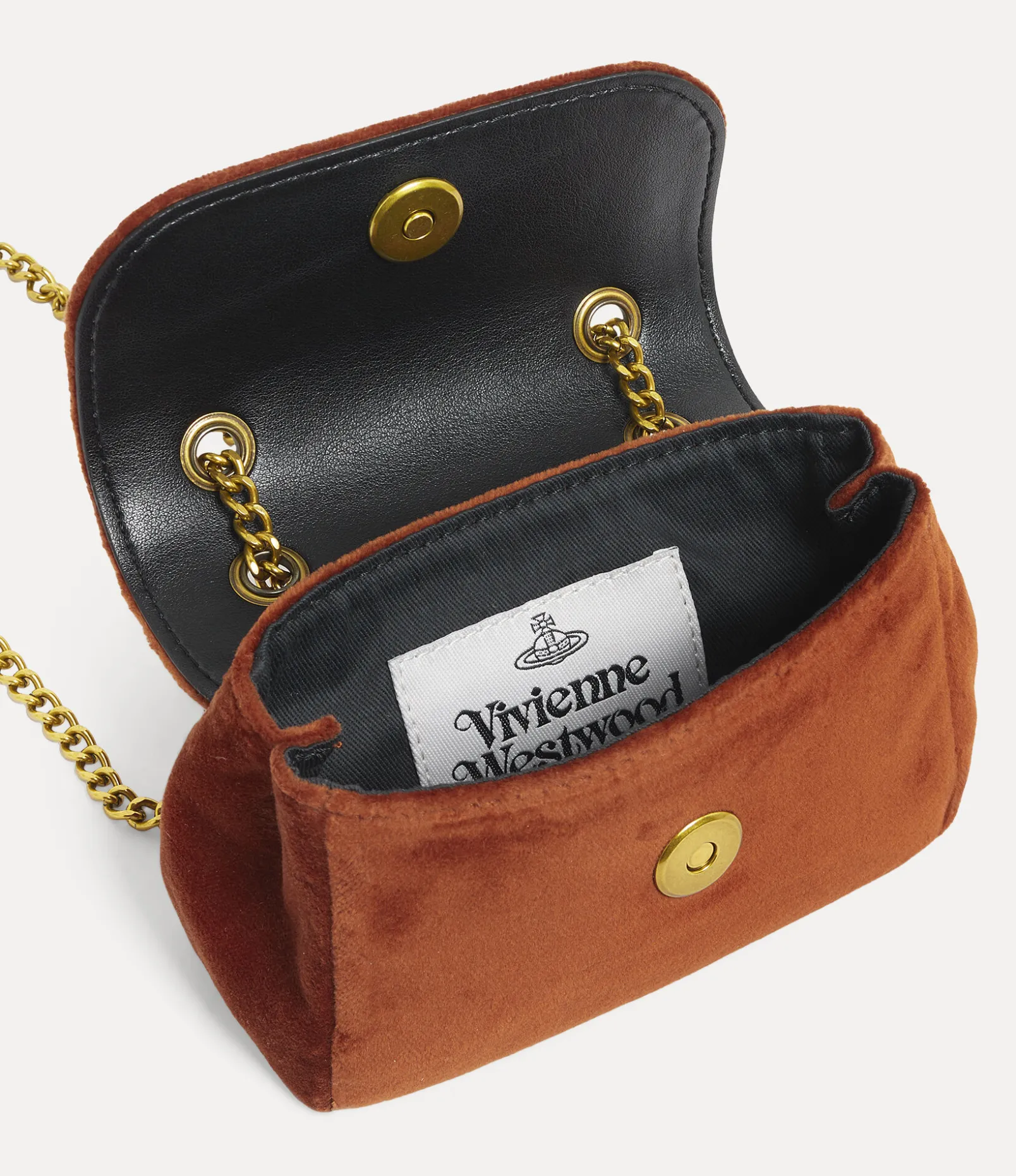 Our Small purse receives a rectangular silhouette, complete with a classic brass chain and an antique gold-tone orb plaque on the magnetic closure – recalling Vivienne’s vision of launching tradition into the future. The piece adopts a soft cotton velvet finish, paying homage to the opulent furniture of the early 19th century, a key influence for this season’s collection.