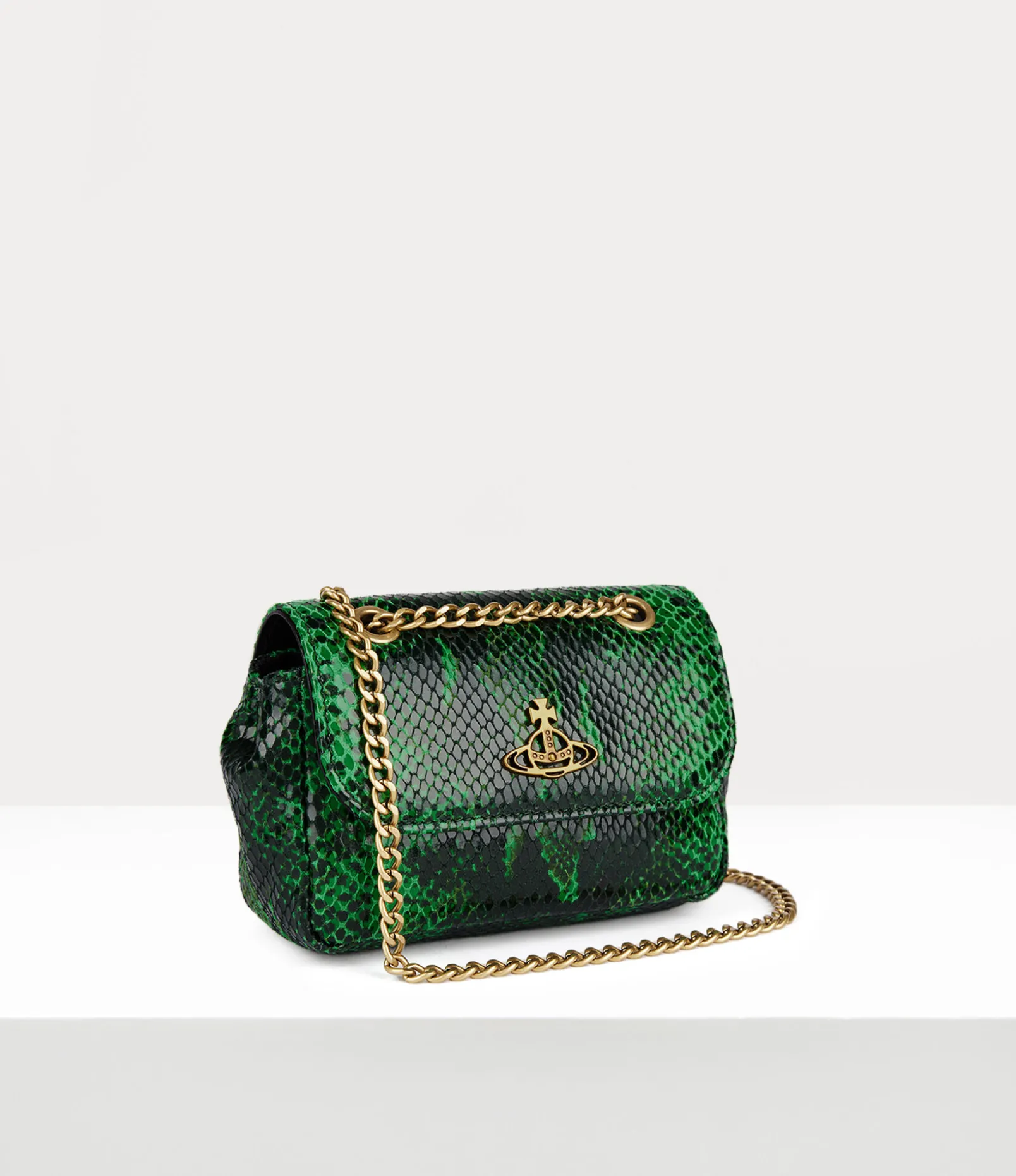 This season, our signature Small Purse With Chain handbag receives our embossed ‘snakeskin’ pattern, inspired by the archive Hammerhead trainers, first seen in our 1982 ‘Savage’ collection. The addition of the silver-tone orb plaque on the front panel pays homage to Vivienne’s vision for taking tradition into the future.